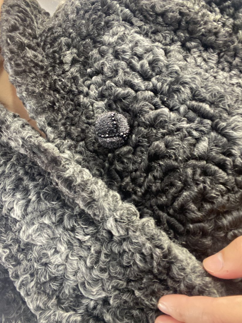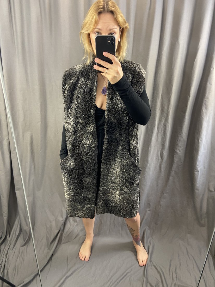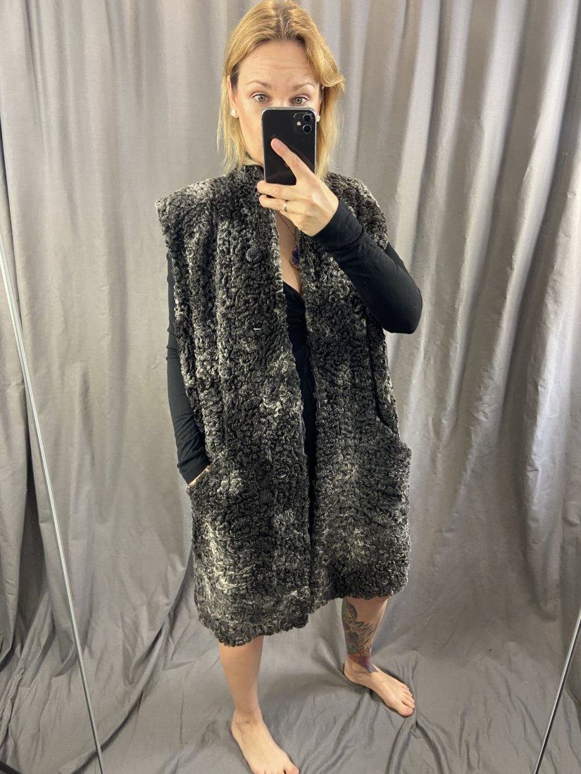 Karakuły. Boska kamizelka z satynową podszewkę. Nowa kosztowała krocie. Zapinana na jeden ozdobny guzik + kryte zapięcia. Posiada dwie pojemne kieszenie. Po bokach rozporki.
