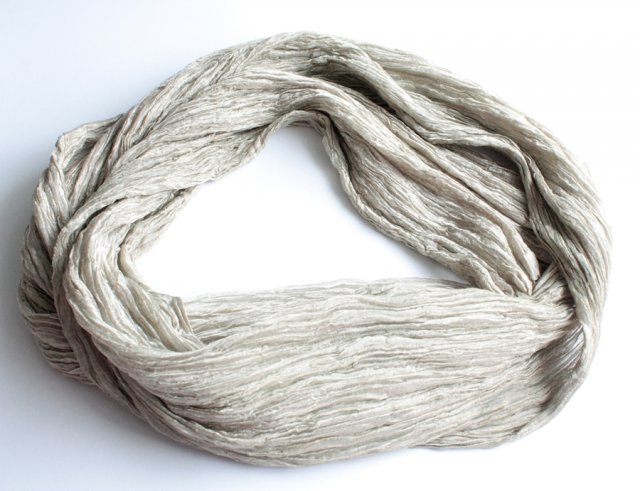 Duży, karbowany szal o delikatnym perłowym (nie: satynowym) połysku. Materiał oceniam na poliester. Nie jest to typ lejącego delikatnego materiału.