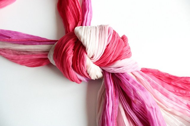 Cieniowany szal o karbowanej strukturze. Materiał to prawdopodobnie jedwab naturalny lub syntetyczny.