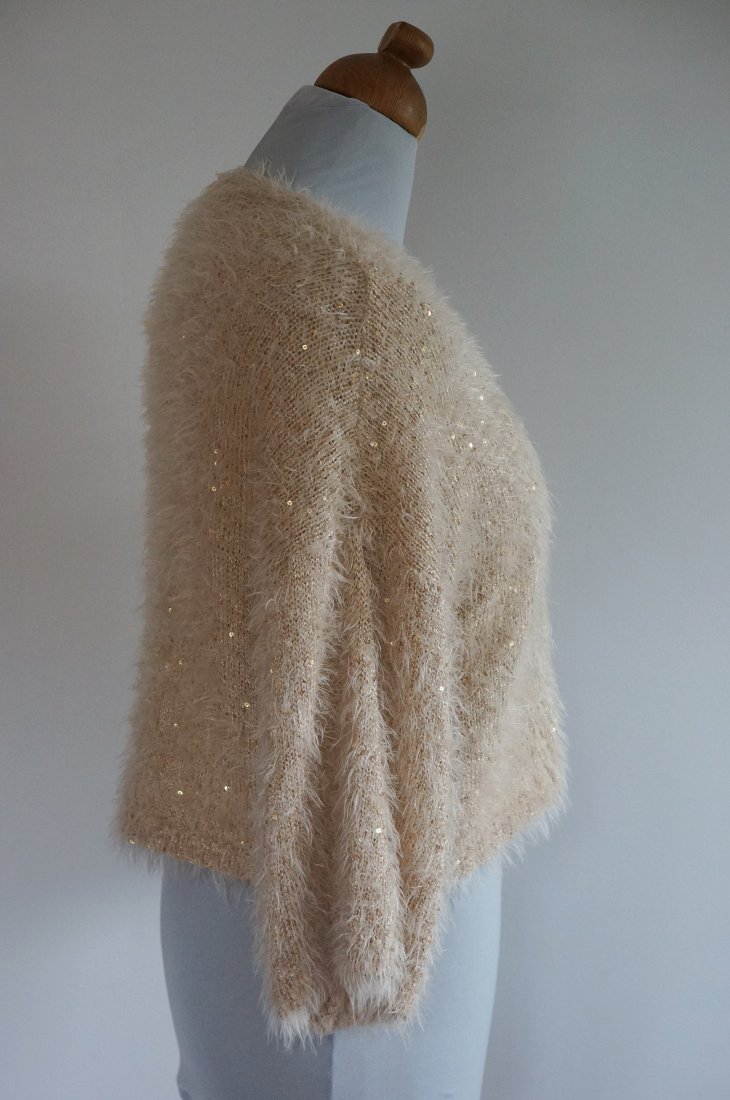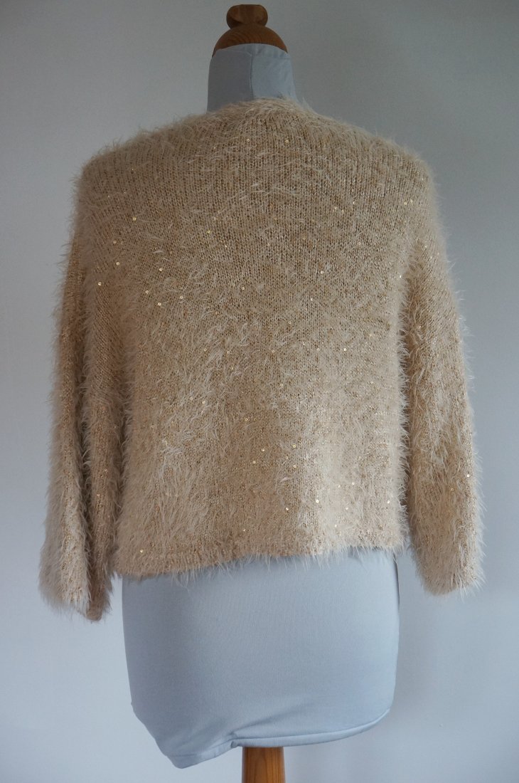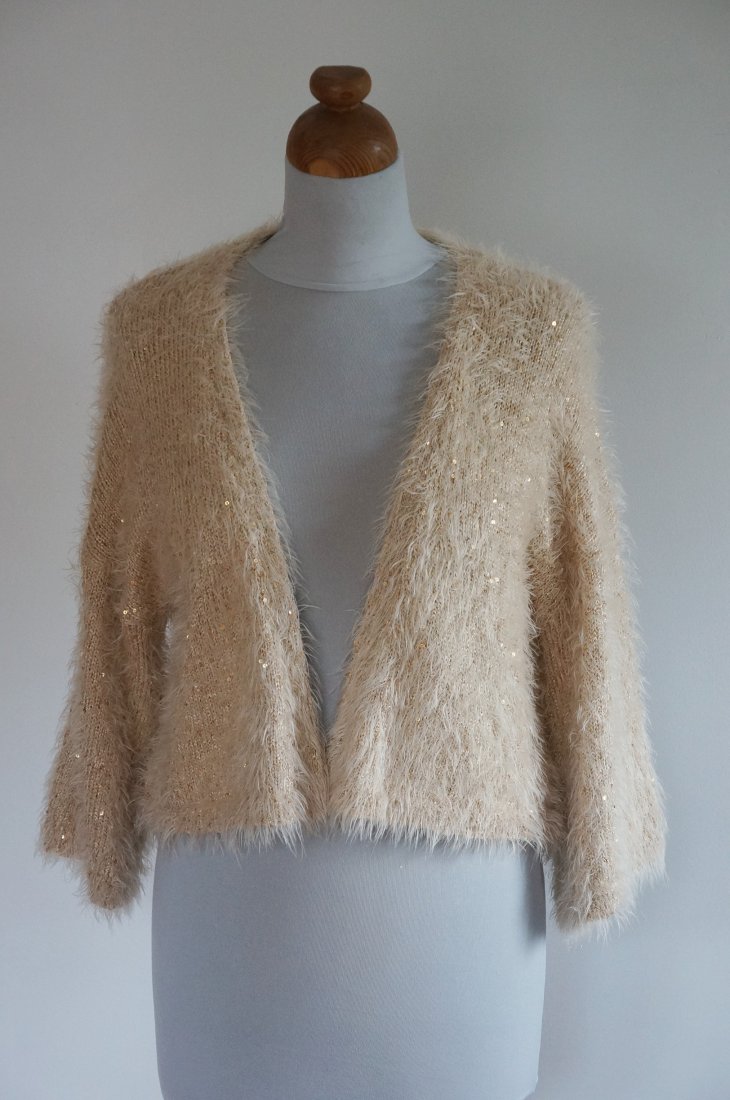 Krótki, "włochaty" kardigan damski. Bez zapięcia. Włóczka akrylowa, ozdobiona metaliczną nicią w kolorze złotym. Rękawy wszyte kimonowo. Kolor łososiowy. Stan bardzo dobry.