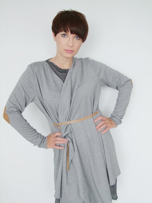 Kardigan z nowej kolekcji jesień zima 2013 by momo wykonany z miękkiej przyjemnej w dotyku dzianiny w kolorze szarym melanż z przedłużonymi rękawami na łokciach z naturalnej skóry ozdobne łatki zapinany na pasek również z naturalnej skóry modelka na zdjęciu 170 rozmiar 36-38 pasuje do rozmiaru 40 dodatki do stylizacji również do zakupienia: tunika szara, rękawiczki i torba borba by momo.