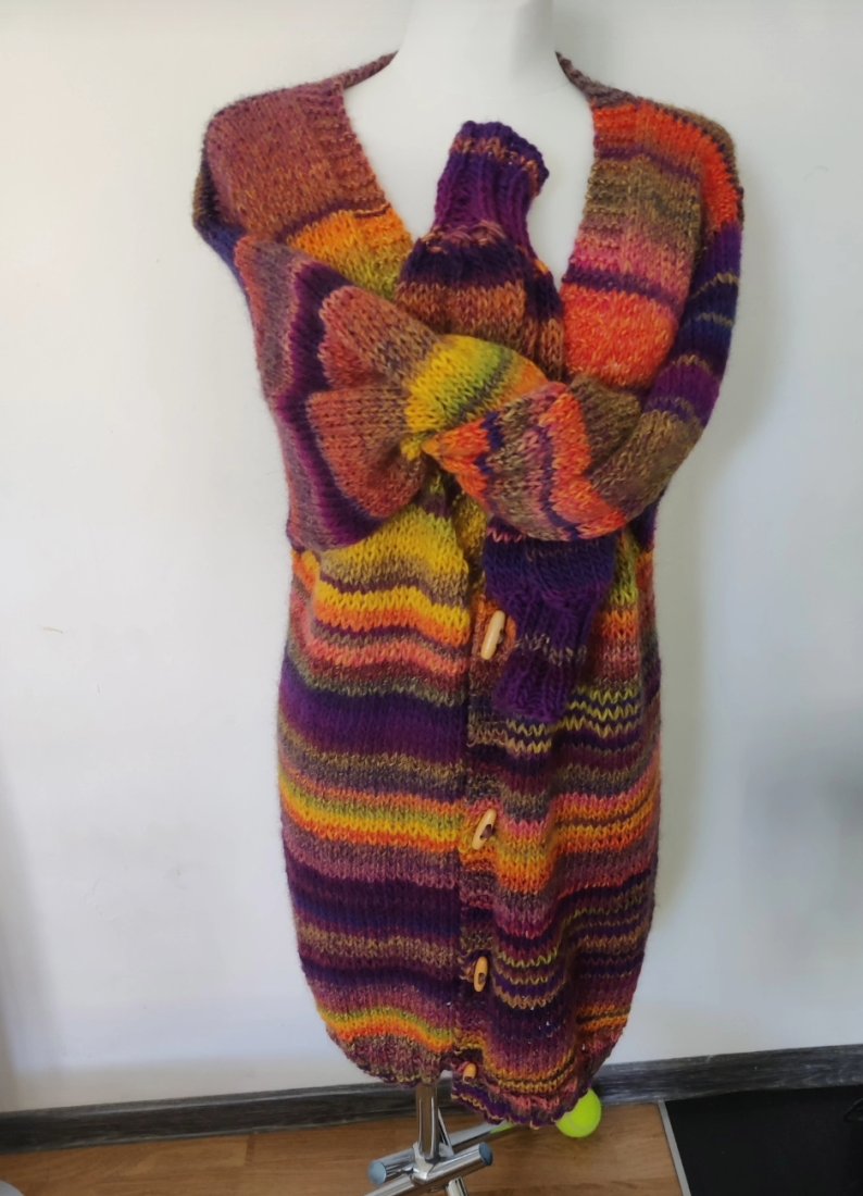 Kolorowy kardigan damski ręcznie zrobiony z naturalnych włókien i akrylu.