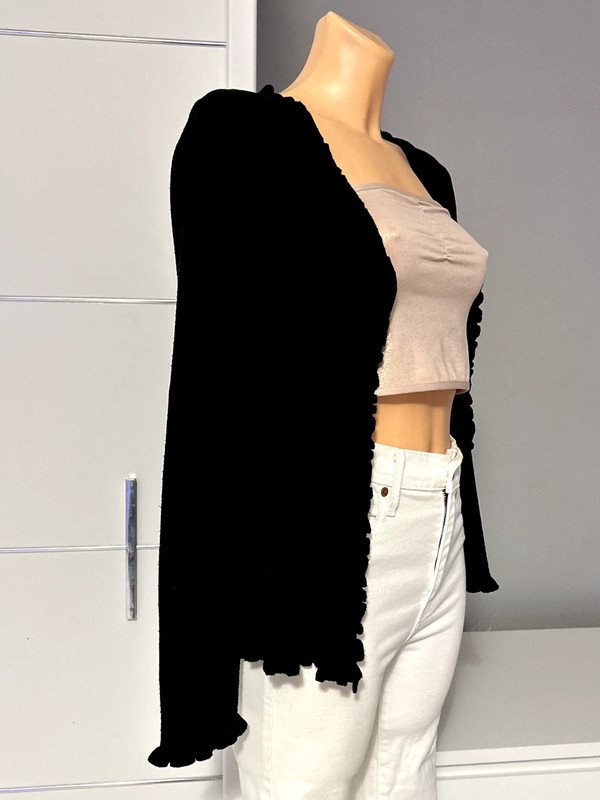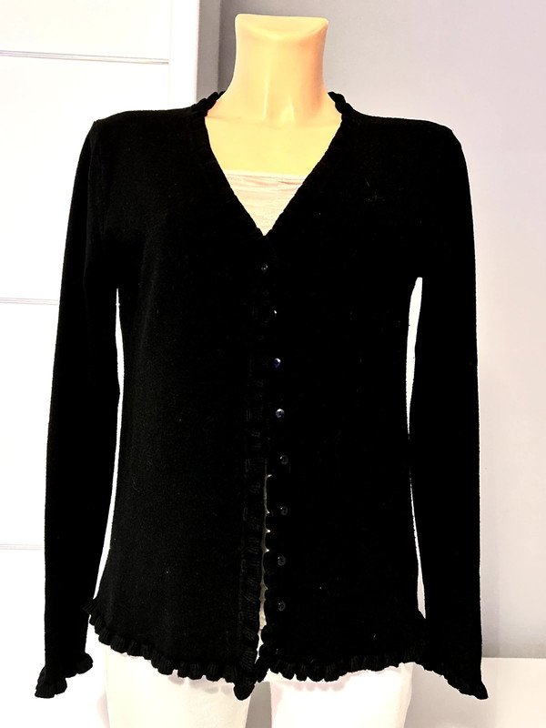 Kardigan z guzikami firmy DLSH, rozmiar określam jako M/L. Ma maleńką, delikatną falbankę przy dekolcie i guzikach oraz rękawach. Kolor mocno czarny, dekolt v.