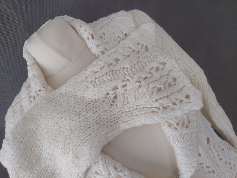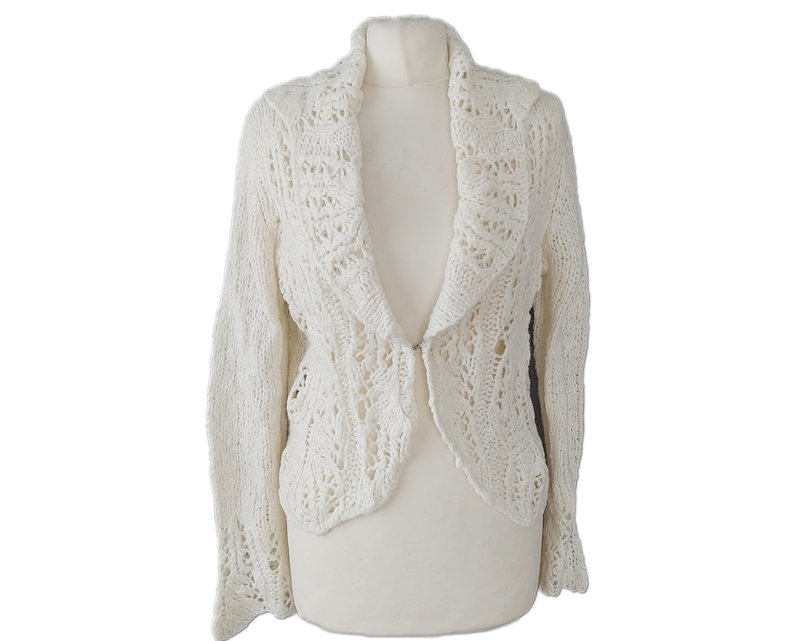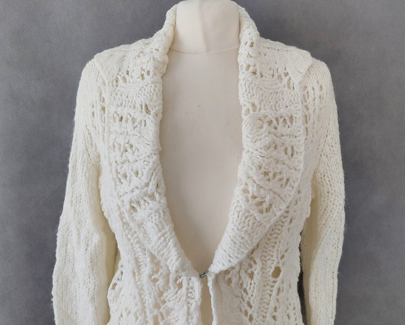 Bardzo nastrojowy, ciepły kardigan vintage, który nadaje każdej stylizacji wyjątkowego charakteru. Krój z półokrągłym dołem i ciekawym wykończeniem rękawów sprawia, że wyróżnia się spośród innych. Kremowy kolor doskonale pasuje do klasycznych zestawów, szczególnie podczas sesji w stylu vintage. Świetnie komponuje się z sukienką w kratę, tworząc elegancki i nostalgiczny look.