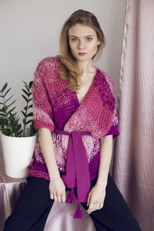 Delikatny kardigan z mieszanki przędz- moherowej, wełny i akrylu w kolorach różu. Wykonany ręcznie na grubych drutach. Sweter jest lekki o luźnym przewiewnym splocie. Sweter jest bardzo uniwersalny. Pasuje do jeansów, eleganckich spodni, ale również do spódnic i romantycznych sukienek.