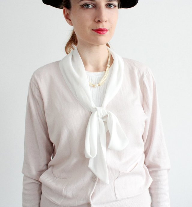 Jasnobeżowy kardigan z ozdobną szarfą, którą można wiązać na kilka sposobów.