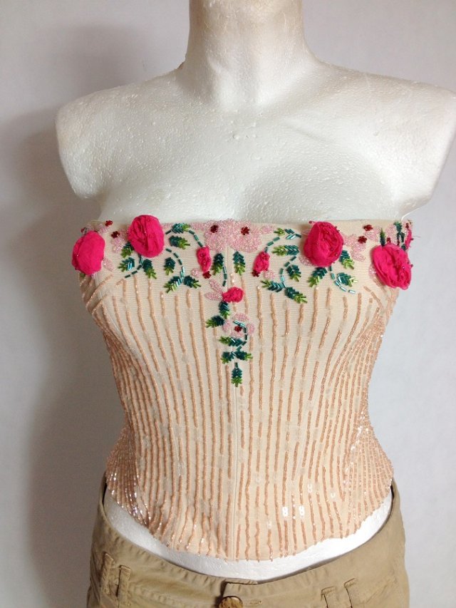 Bogato zdobiona bluzka gorsetowa od KAREN MILLEN, z tyłu zapinana na zaczepy, z przodu wyszywana różnymi kamyczkami, punktowo cekinami, oraz różami.