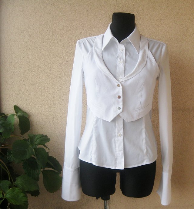 Przepiękna koszula od projektantki Karen Millen. Dopracowana w każdym szczególe. Materiał 63% bawełna, 37% poliester, lekko naciągający się. Koszula taliowana, mankiety do spinek. Kamizelka, mankiety i patka z tyłu, z materiału prążkowanego. Kamizelka podszyta atłasową podszewką. Logowane guziczki i zatrzaski. Stan bardzo dobry. Brak ostatniego guziczka. Rozmiar z metki 40, na manekinie o rozmiarze 38. Podaję wymiary mierzone na płasko;