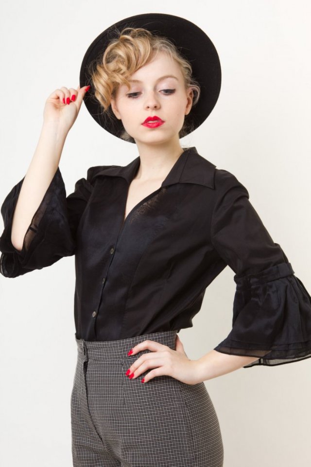 Czarna elegancka koszula Karen Millen zapinana z przodu na logowane guziczki. Koszula jest wymodelowana za pomocą zaszewek, ładnie przylega i podkreśla kobiece kształty. Posiada transparentną wstawkę na plecach, kołnierzyk oraz ciekawe rękawy 3/4 ozdobione z boku kokardką.