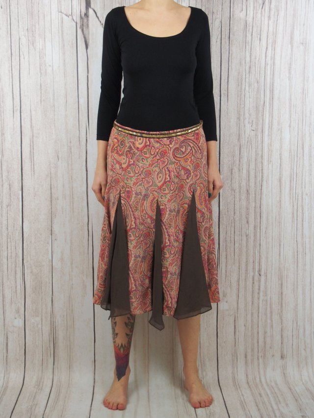 Spódnica od projektantki Karen Millen. Materiał: główny - jedwab, podszewka polietster, pasek - nylon, zdobienia - winyl 53%, akryl 26%, nylon 11%, poliester 6%, bawełna 4%.