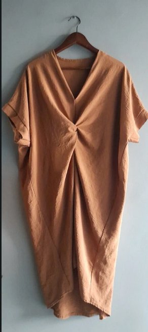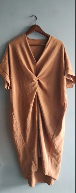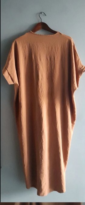 Karmelowy sukienka z lekkiego,zwiewnego ale nie bardzo cienkiego,mięsistego materiału, ponadczasowy fason maskujący niedoskonałości, rozmiar uniwersalny optymalnie od 40 over,42,44,46, brak metek, materiał to na 90% wiskoza,kreszowana, długość 95/120,pod pachami ok68x2