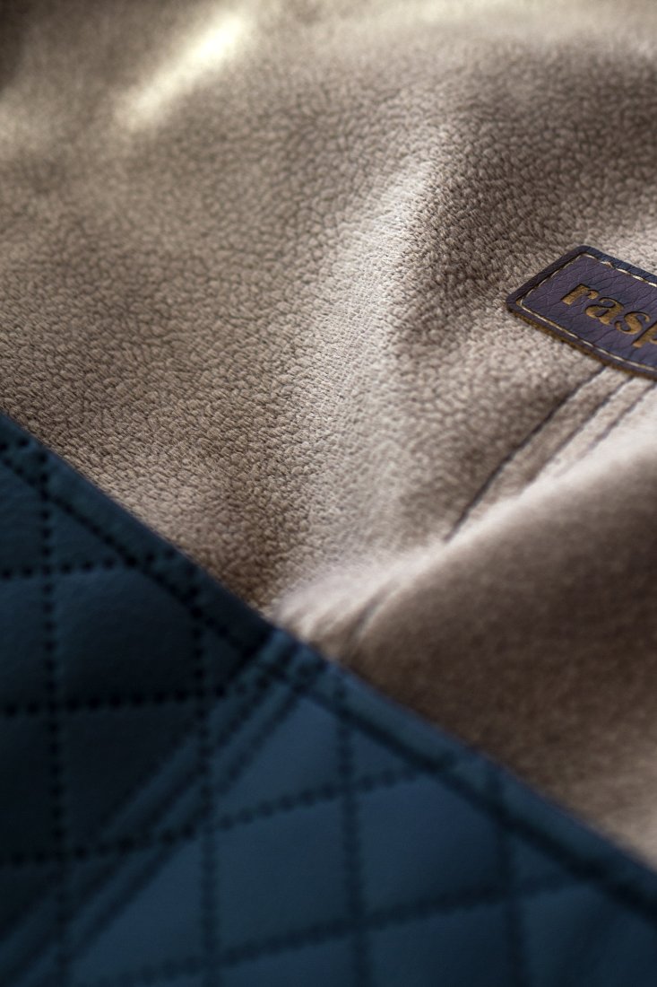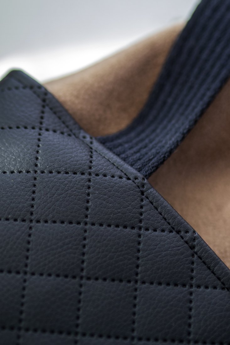 Wykonana z weluru w kolorze karmelowym oraz czarnej pikowanej ekoskóry. Bawełniane, czarne pasy i czarna, gładka, bawełniana podszewka.