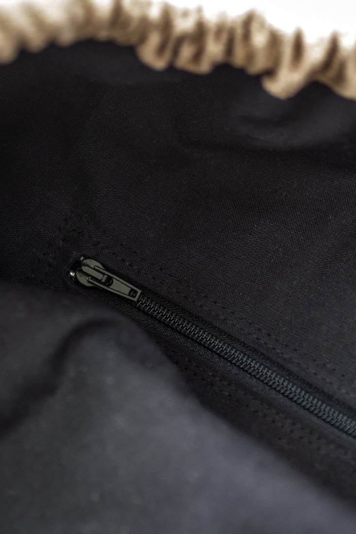 Torba worek ściągana grubym sznurem bawełnianym w rozmiarze XL. Z przodu dwie kieszenie, w środku kieszonka zapinana na suwak. Sznurek w kolorze czarnym.