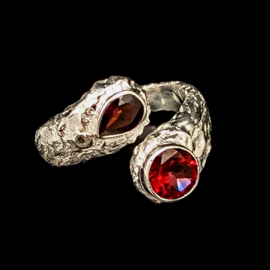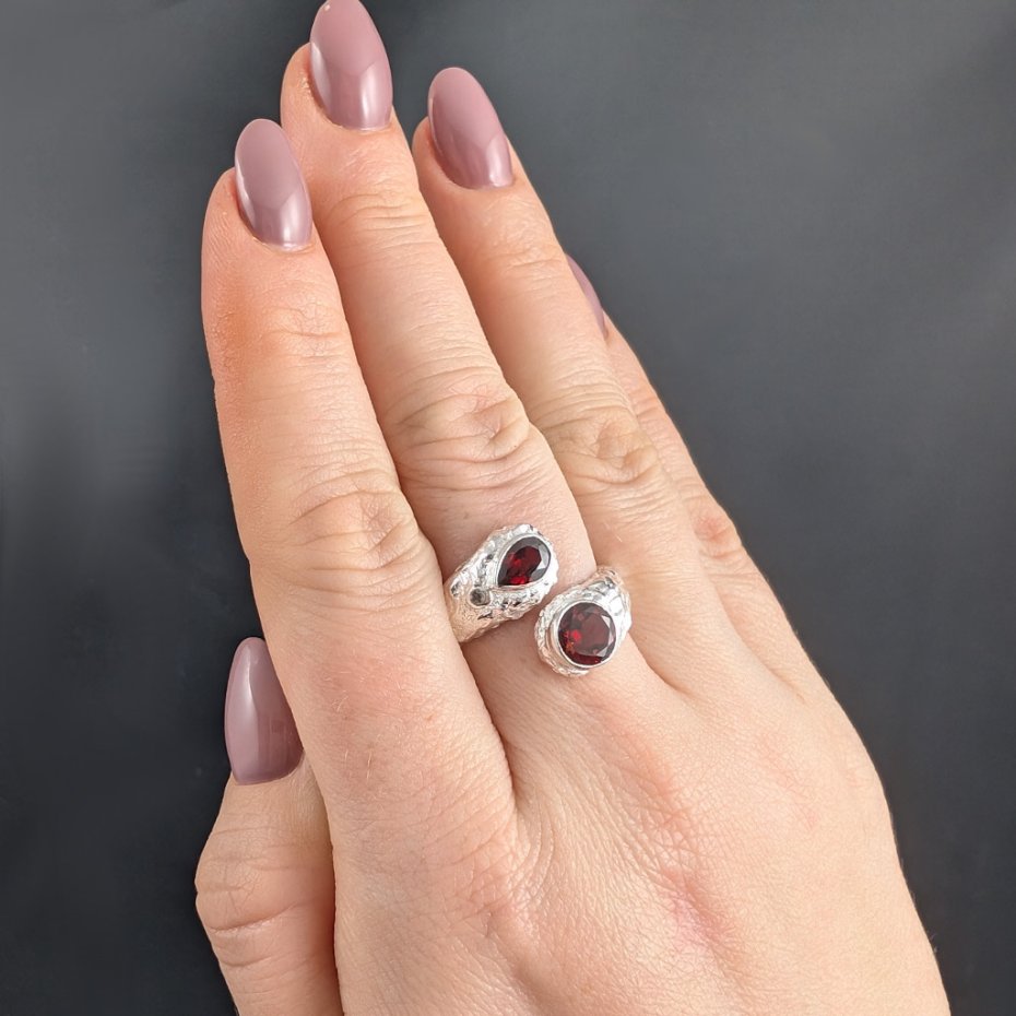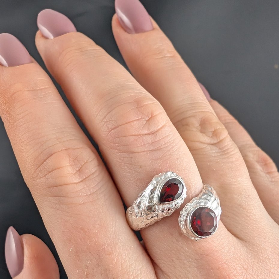 Pierścień wykonany ze srebra pr. 925 oraz przepięknych granatów w oprawie 7,5 x 5 mm oraz okrągły 7 mm. Łezka ma obok wkomponowany maleńki surowy diament. Przeuroczy. Rozmiar jubilerski min 14, max 19. Ustawię odpowiedni, proszę o wiadomość. Waga 8 g. Wykonany przez dostawcę kamieni. Pierścień zostanie zapakowany w ozdobne pudełeczko.