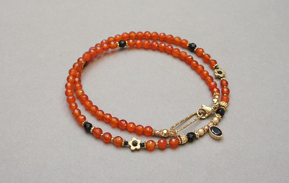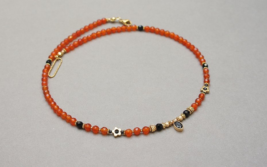 Krótki, delikatny naszyjnik wykonany w całości z pozłacanej stali szlachetnej oraz naturalnych kamieni - fasetowanego karneolu [4mm], fasetowanego onyksu [4mm], przekładek z hematytu [1mm], hematytu fasetowanego, matowego [2mm, 3mm], kwiatków z hematytu [6mm], oraz zawieszki z cyrkonią w okuciu. Naszyjnik o długości ok. 43,5cm.
