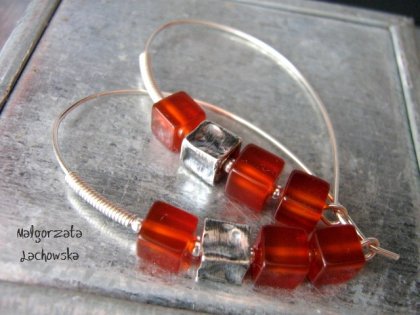 Kolczyki wykonane z kostek karneolu wilekosci 6 mm oraz srebra próby 925. Długośc kolczyków wynosi 5 cm.
