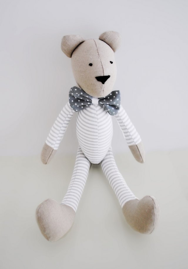 Karol to miś wykonany z szarej bawełny w paski i lnu, wypełnienie antyalergiczne. Na siedząco mierzy 20cm, po wyprostowaniu nóg ok. 30cm. Miś siedzi, porusza nogami i rękami, nie stoi. Kończyny przymocowane do tułowia przy pomocy guzików, oczy i nos haftowane. Idealny do dekoracji pokoju dziecięcego.