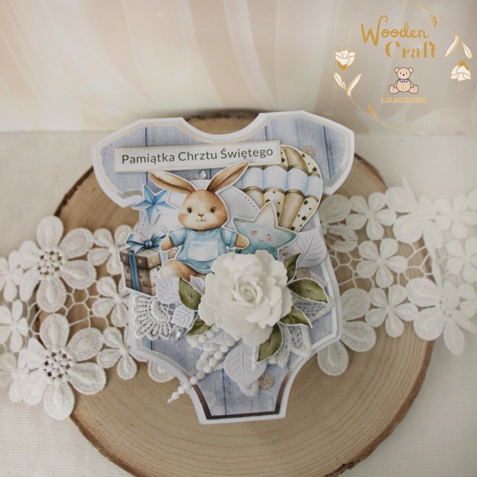Urocza i nietuzinkowa kartka z okazji Chrztu Świętego, w kształcie dziecięcego body, wykonana z mixu dziecięcych kolekcji papierów, utrzymana w odcieniach bieli, beżu i delikatnego błękitu różu, z dodatkiem błyszczących, srebrnych akcentów. Kartka wykonana ręcznie z dbałością o każdy szczegół. Na środku znajduje się grafika słodkiego króliczka, ozdobiona kompozycją kwiatową z ręcznie robioną różyczką, dodatkowo zdobiona grafikami gwiazdki, balonika i prezentu, kryształkami oraz połyskującymi cekinami, a także napisem "Pamiątka Chrztu Świętego" (na życzenie mogę dodać również imię dziecka, bądź całkowicie zmienić napis na dowolny - w zależności od okazji).