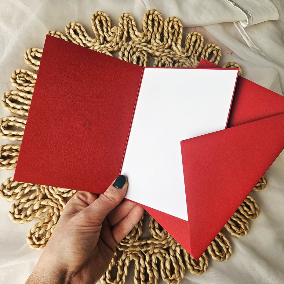 Kartka w formacie A6 (10,5x14,8 cm), do której dołączam kopertę.