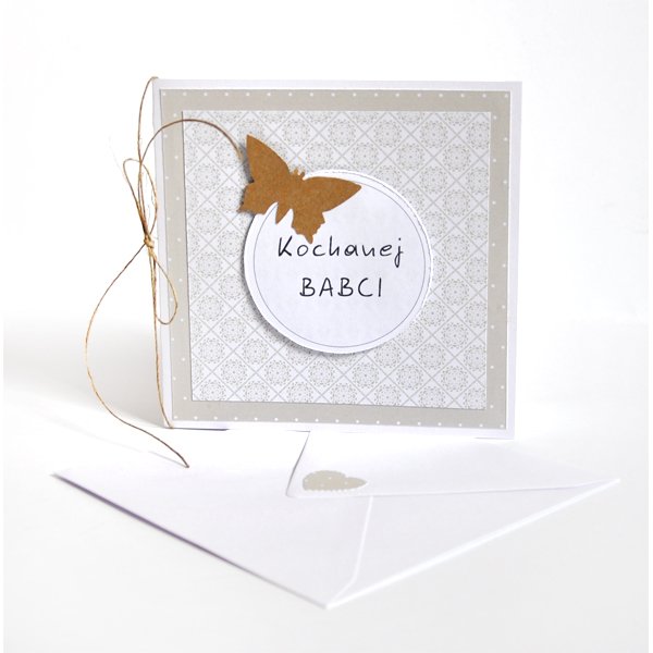 Kartka okazjonalna, wykonana ręcznie dla Babci, otwierana w komplecie z kopertą o wymiarach 14 cm x 14 cm.