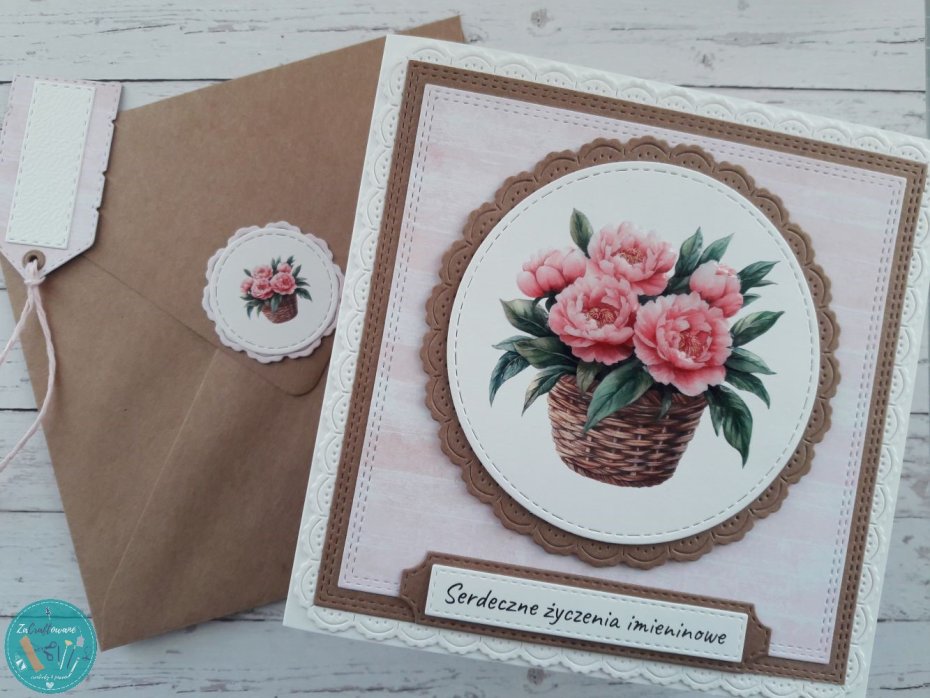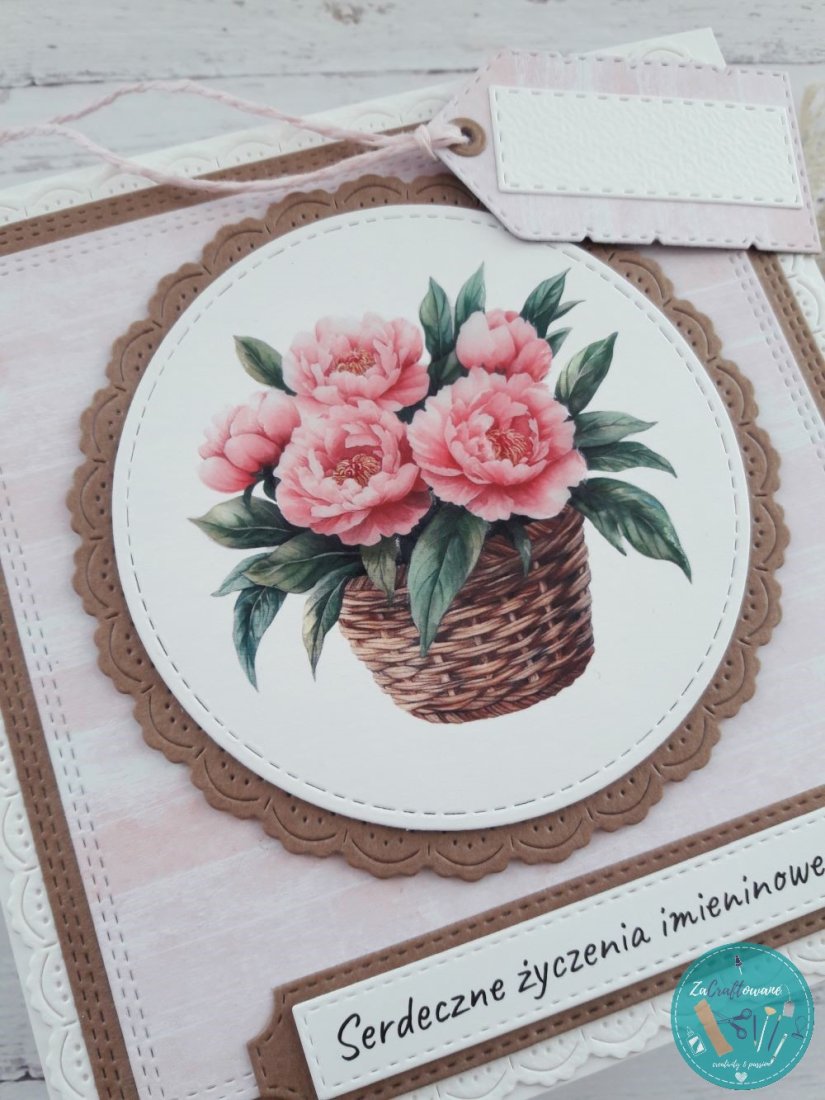 Ręcznie robiona kartka imieninowa z piwoniami wykonana metodą scrapbookingu z wykorzystaniem profesjonalnych materiałów i z dbałością o każdy szczegół.