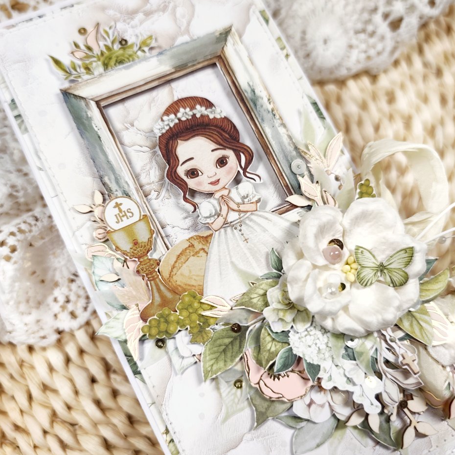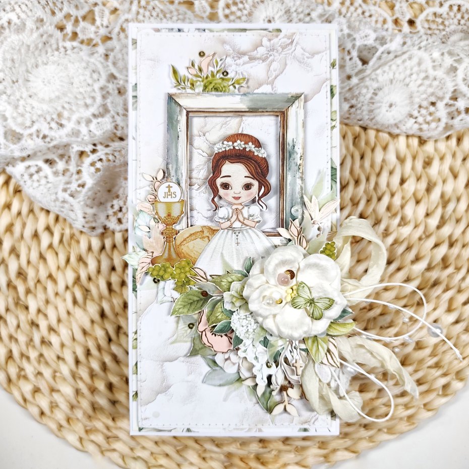 Każda kartka posiada unikalną kompozycję, wykonaną z delikatnej koronki oraz eleganckich kwiatków. Nie ma dwóch identycznych kartek — każda jest jedyna w swoim rodzaju.
