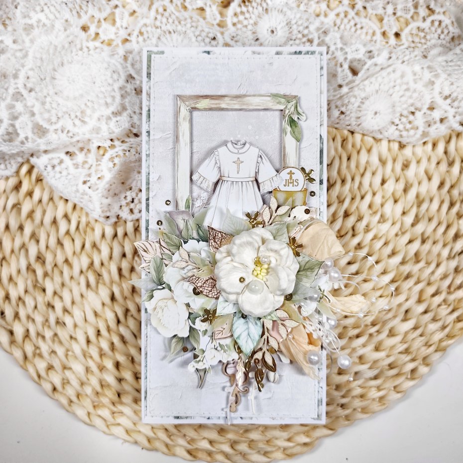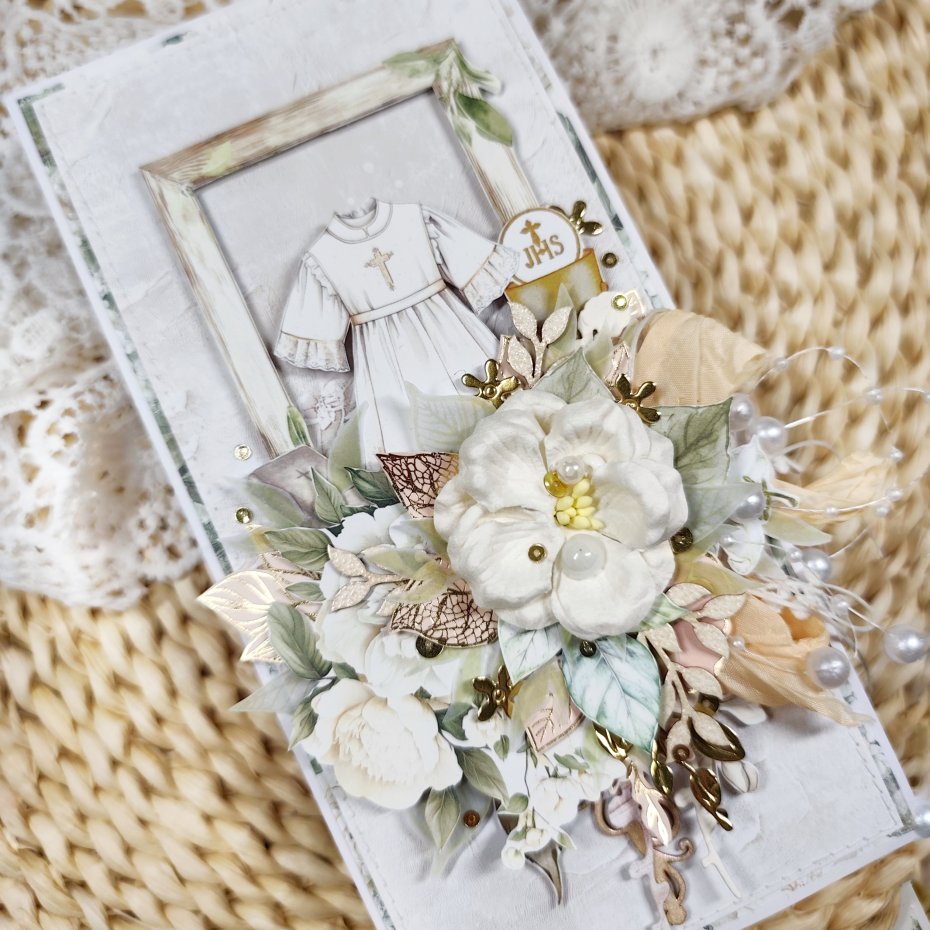 Każda kartka posiada unikalną kompozycję, wykonaną z delikatnej koronki oraz eleganckich kwiatków. Nie ma dwóch identycznych kartek — każda jest jedyna w swoim rodzaju.