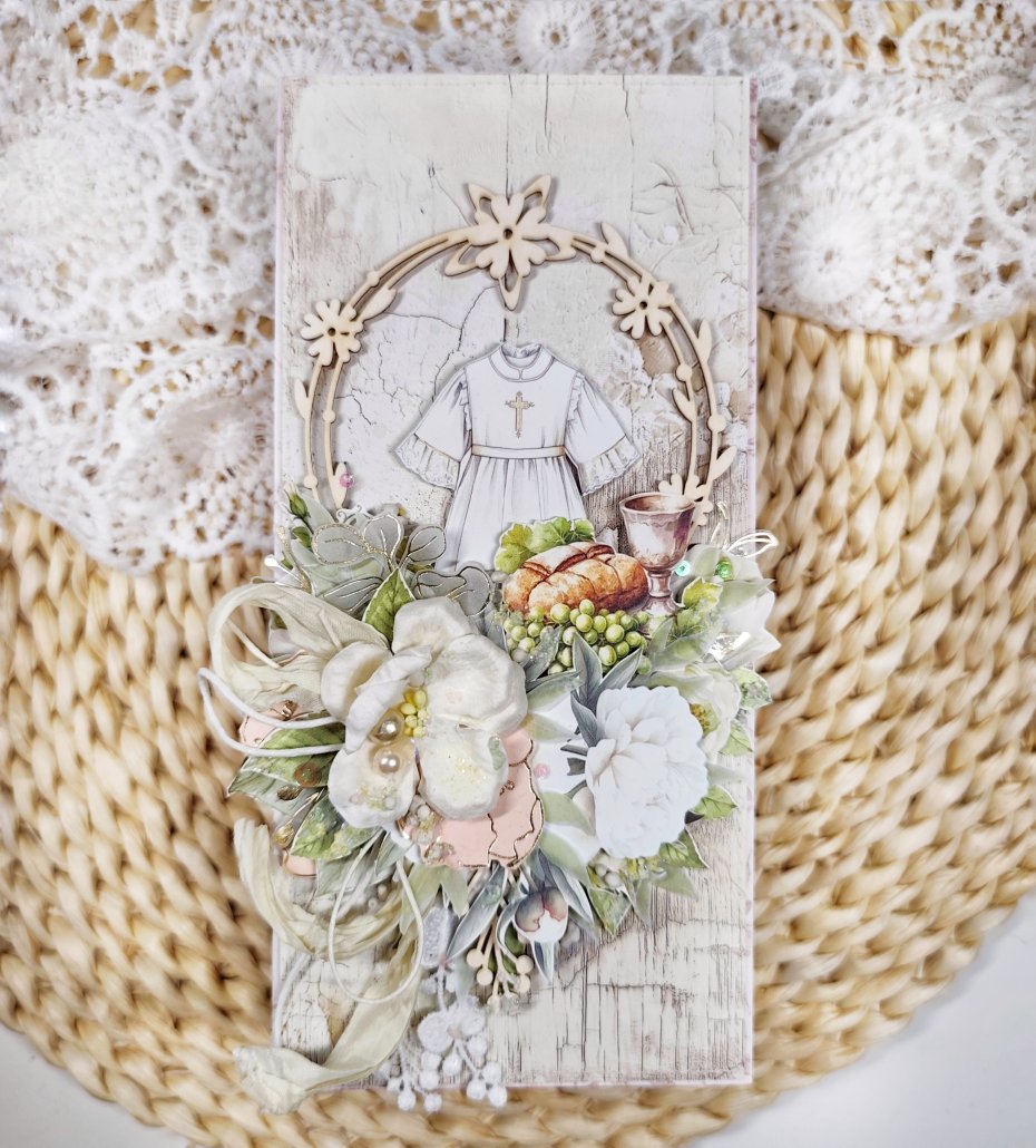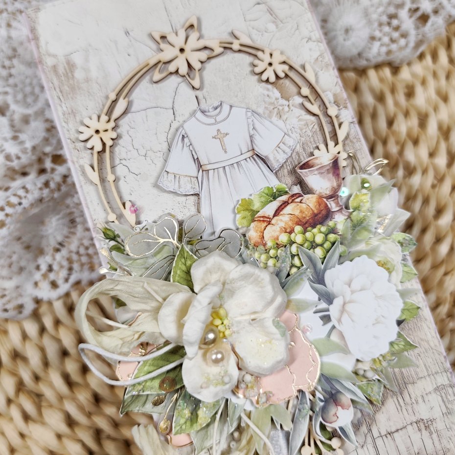 Każda kartka posiada unikalną kompozycję, wykonaną z delikatnej koronki oraz eleganckich kwiatków. Nie ma dwóch identycznych kartek — każda jest jedyna w swoim rodzaju.