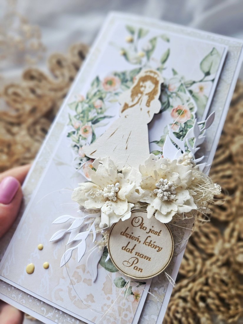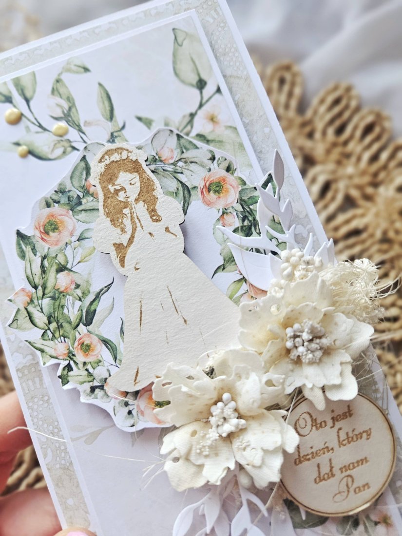 Kartka oklejona papierami z nadrukiem w kolorze beżpowym. Na froncie sylwetka dziwczynki na drewienku oraz napis. Jako dodatki kwiaty z materiału, elementy papierowe oraz perełki.