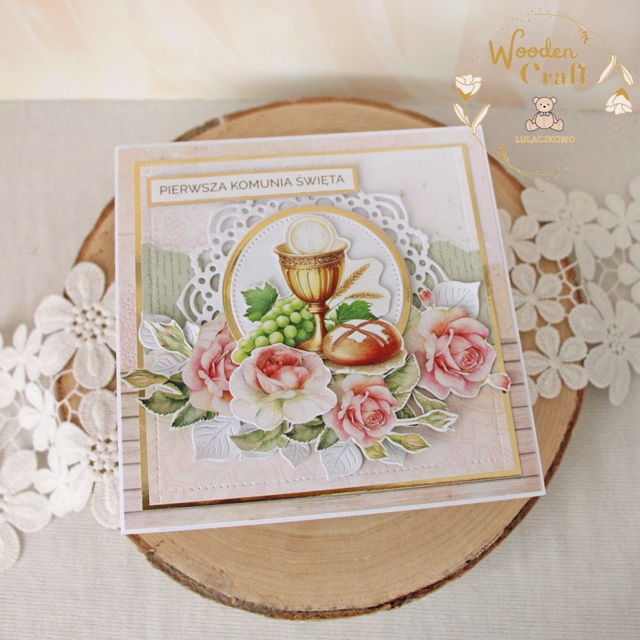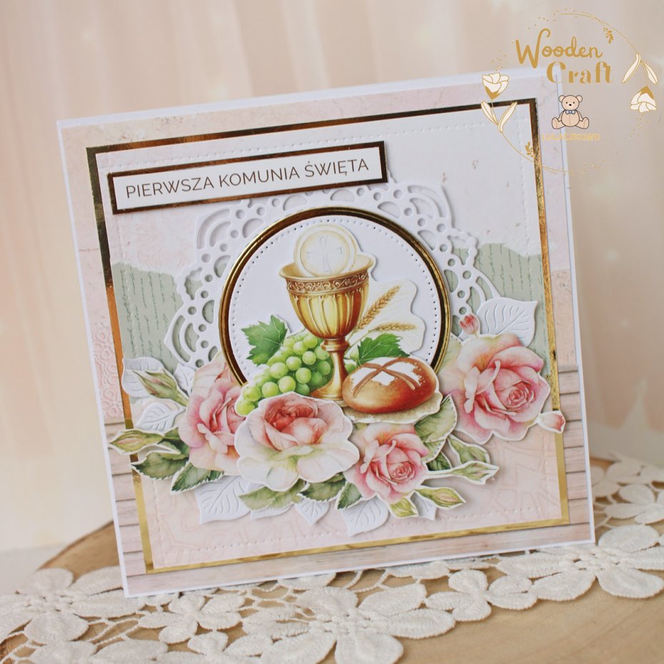Piękna, elegancka kartka komunijna, pamiątka Pierwszej Komunii Świętej, wykonana ręcznie z najwyższą starannością, z cudownej kolekcji papierów "Rose Wine", utrzymana w pastelowych odcieniach malinowego różu, kremu i bieli, z dodatkiem złotych, błyszczących akcentów. Na środku kartki umieszona została grafika kielicha komunijnego z winogronami oraz chlebem otoczona kompozycją kwiatową z grafik przedstawiających róże oraz napisem "Pierwsza Komunia Święta"- do napisu mogę również dodać imię dziecka.