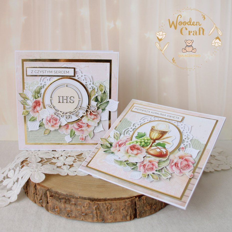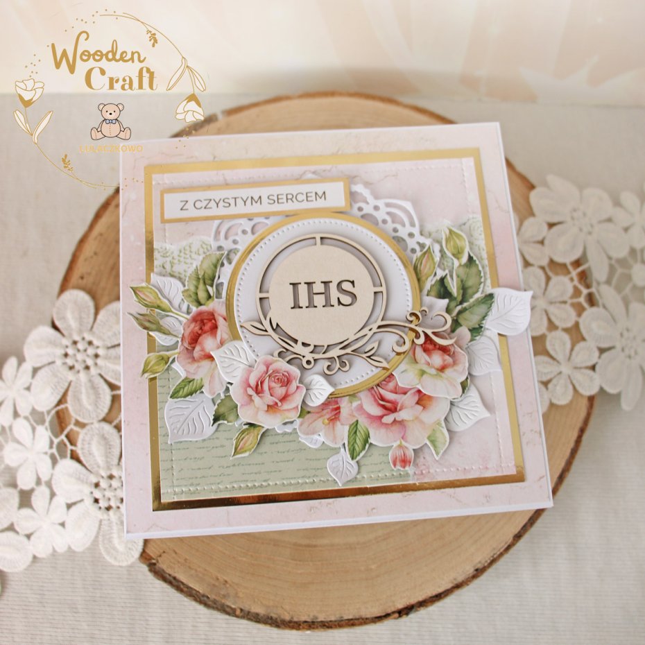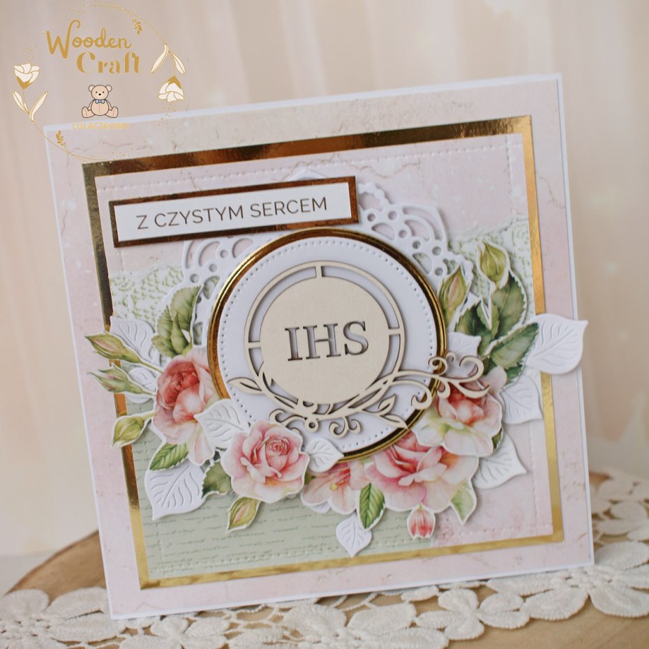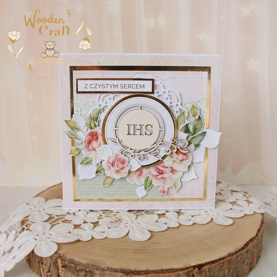Piękna, elegancka kartka komunijna, pamiątka Pierwszej Komunii Świętej, wykonana ręcznie z najwyższą starannością, z cudownej kolekcji papierów "Rose Wine", utrzymana w pastelowych odcieniach malinowego różu, kremu i bieli, z dodatkiem złotych, błyszczących akcentów. Na środku kartki umieszona została tekturka hostii świętej otoczona kompozycją kwiatową z grafik przedstawiających róże oraz napisem "Z Czystym Sercem"- do napisu mogę również dodać imię dziecka lub całkowicie zmienić go na inny.