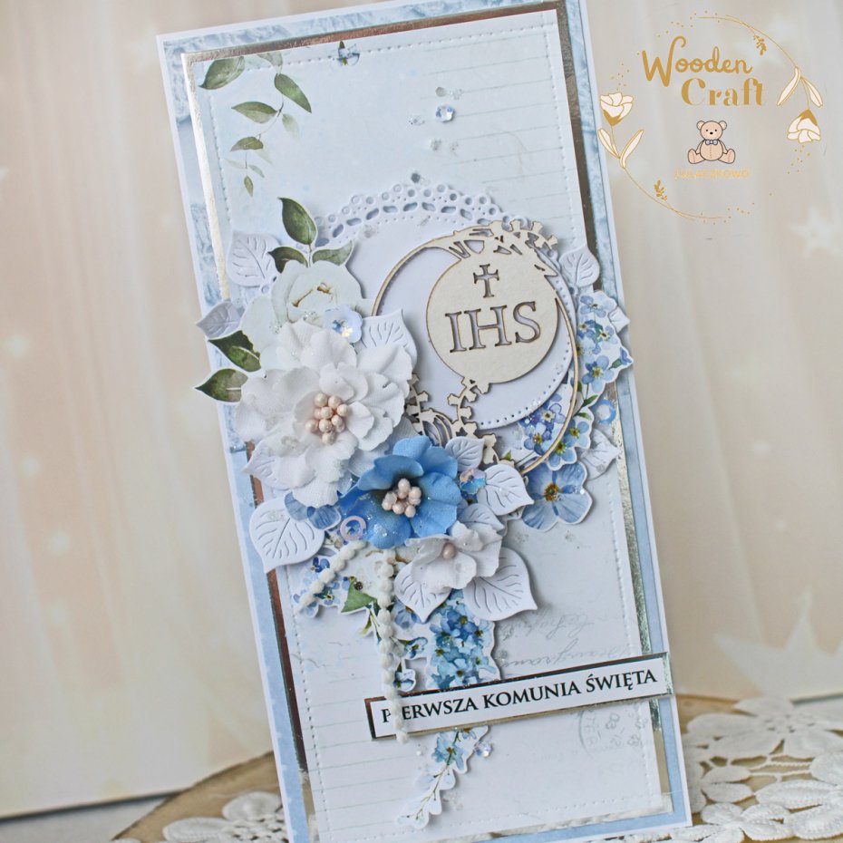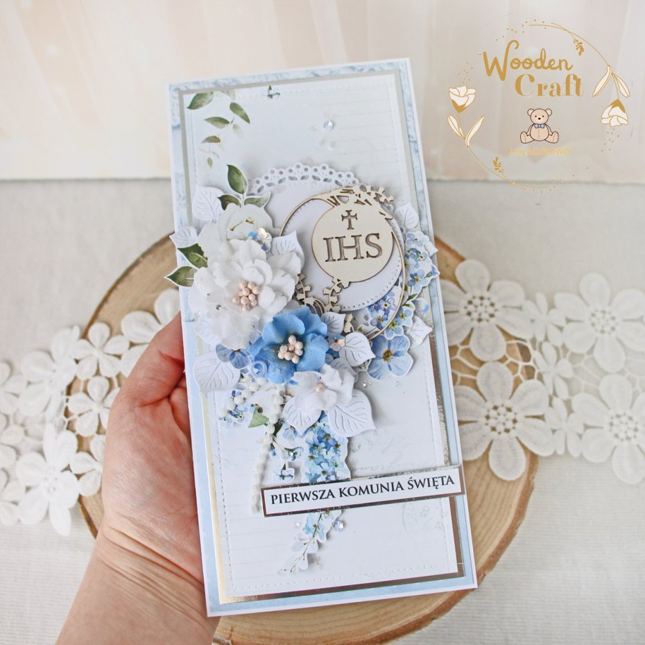 Piękna i elegancka pamiątka Pierwszej Komunii Świętej zamknięta w białym pudełeczku z okienkiem, wykonana ręcznie z najwyższą starannością, z cudownej i delikatnej kolekcji papierów "Lovely Day in Blue", utrzymana w odcieniach błękitu i bieli z dodatkiem srebrnych, błyszczących akcentów. Na środku kartki umieszona została tekturka Hostia Święta, ozdobiona kompozycją kwiatową z ręcznie robionymi kwiatami, udekorowana kryształkami oraz napisem "Pierwsza Komunia Święta"