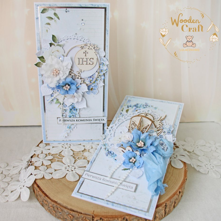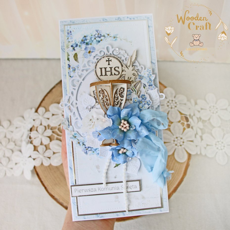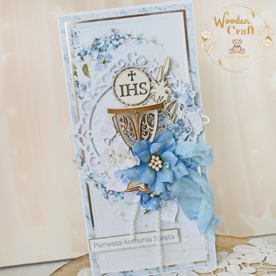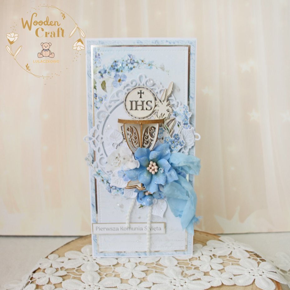 Piękna i elegancka pamiątka Pierwszej Komunii Świętej zamknięta w białym pudełeczku z okienkiem, wykonana ręcznie z najwyższą starannością, z cudownej i delikatnej kolekcji papierów "Lovely Day in Blue", utrzymana w odcieniach błękitu i bieli z dodatkiem srebrnych, błyszczących akcentów, z trójwymiarową tekturką - kielichem z hostią świętą. Hostia Święta, ozdobiona kompozycją kwiatową z ręcznie robionymi kwiatami, udekorowana kryształkami, kokardą oraz napisem "Pierwsza Komunia Święta"
