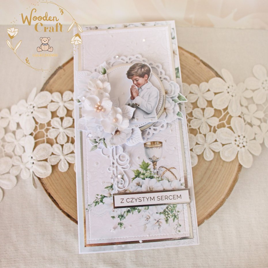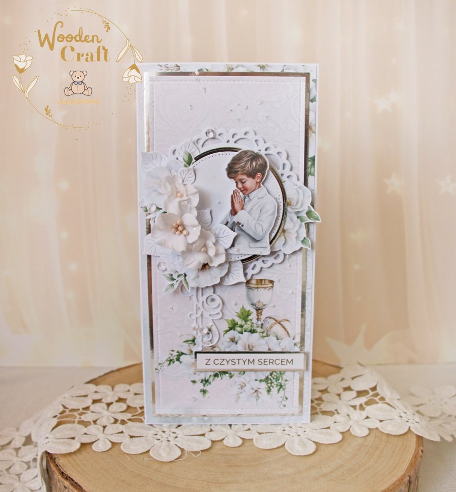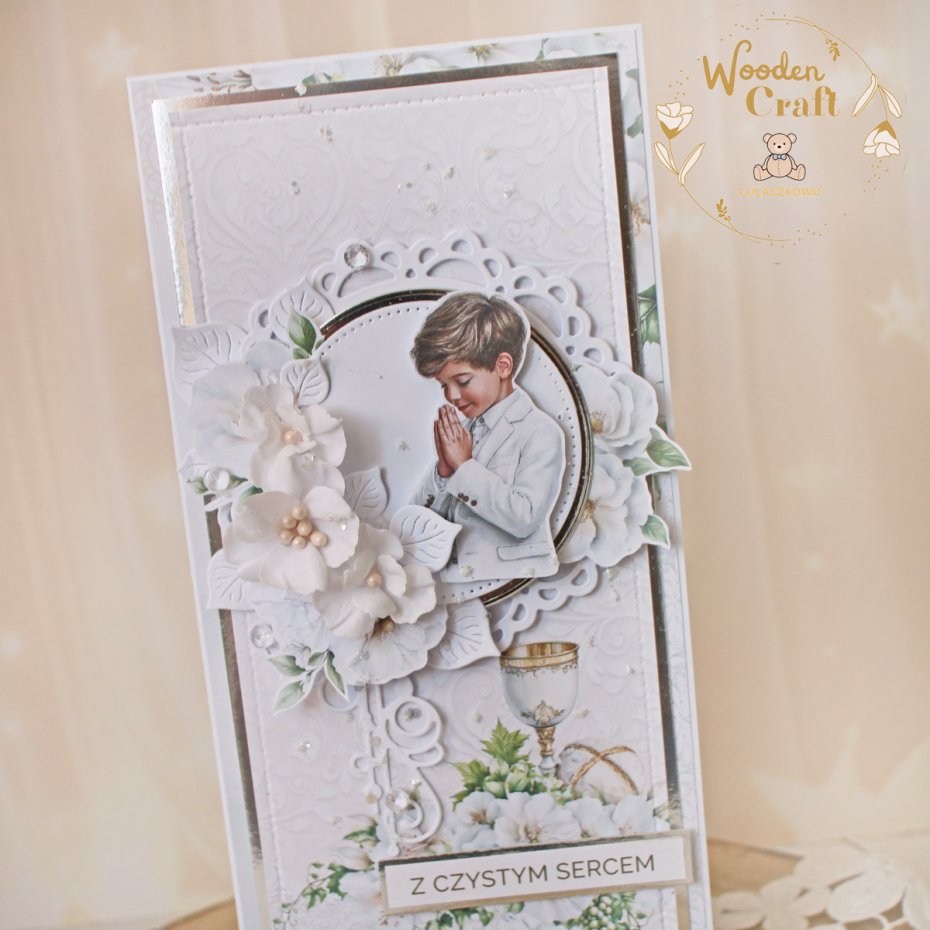 Piękna i elegancka pamiątka Pierwszej Komunii Świętej zamknięta w białym pudełeczku z okienkiem, wykonana ręcznie z najwyższą starannością, z cudownej i delikatnej kolekcji papierów "Holy Comm 4", utrzymana w odcieniach bieli oraz zieleni z dodatkiem srebrnych, błyszczących akcentów. Na środku kartki umieszona została grafika modlącego się chłopca komunijnego, ozdobiona kompozycją kwiatową z ręcznie robionymi kwiatami, udekorowana kryształkami oraz napisem "Z Czystym Sercem"