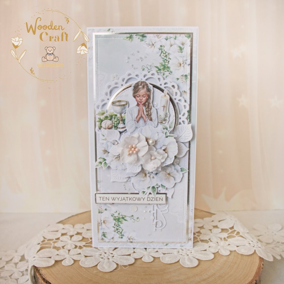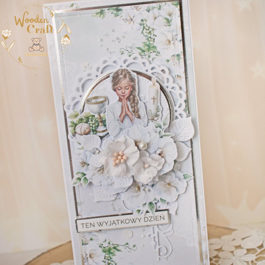 Piękna i elegancka pamiątka Pierwszej Komunii Świętej zamknięta w białym pudełeczku z okienkiem, wykonana ręcznie z najwyższą starannością, z cudownej i delikatnej kolekcji papierów "Holy Comm 4", utrzymana w odcieniach bieli oraz zieleni z dodatkiem srebrnych, błyszczących akcentów. Na środku kartki umieszona została grafika modlącej się dziewczynki komunijnej, ozdobiona kompozycją kwiatową z ręcznie robionymi kwiatami, udekorowana kryształkami oraz napisem "Ten Wyjątkowy Dzień"