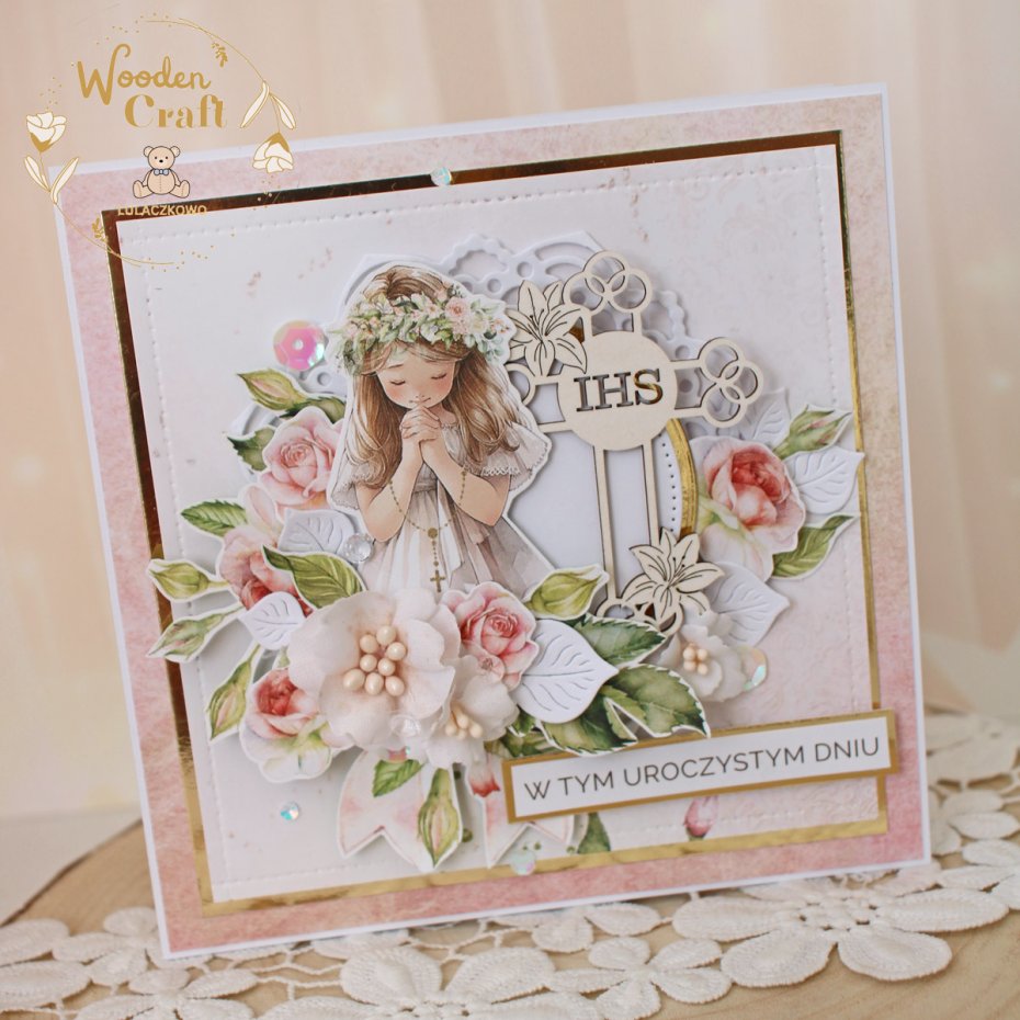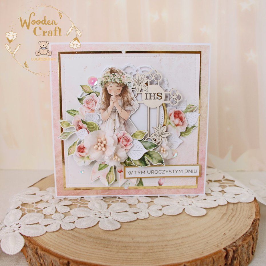 Piękna, elegancka kartka komunijna, pamiątka Pierwszej Komunii Świętej, wykonana ręcznie z najwyższą starannością, z cudownej kolekcji papierów "Rose Wine", utrzymana w pastelowych odcieniach malinowego różu, kremu i bieli, z dodatkiem złotych, błyszczących akcentów. Na środku kartki umieszona została grafika dziewczynki i tekturki krzyża z hostią świętą, otoczona kompozycją kwiatową, z ręcznie wykonanymi, materiałowymi kwiatami, oraz napisem "W Tym Uroczystym Dniu"- do napisu mogę również dodać imię dziecka.