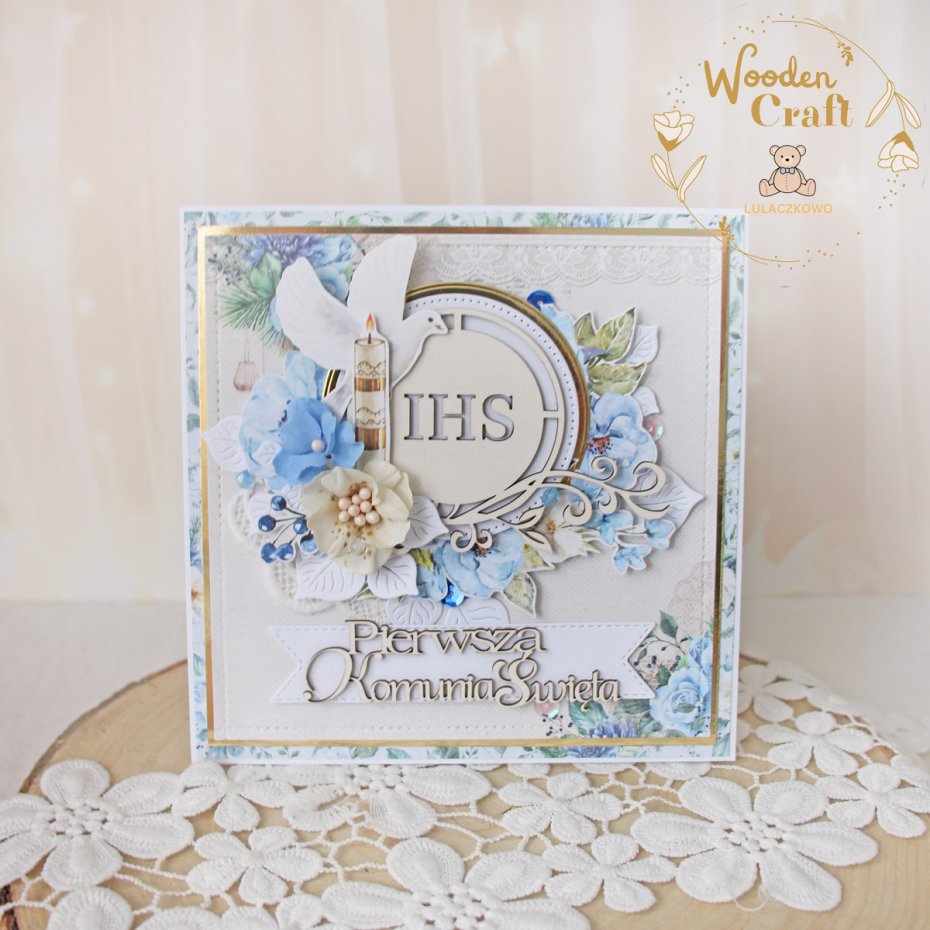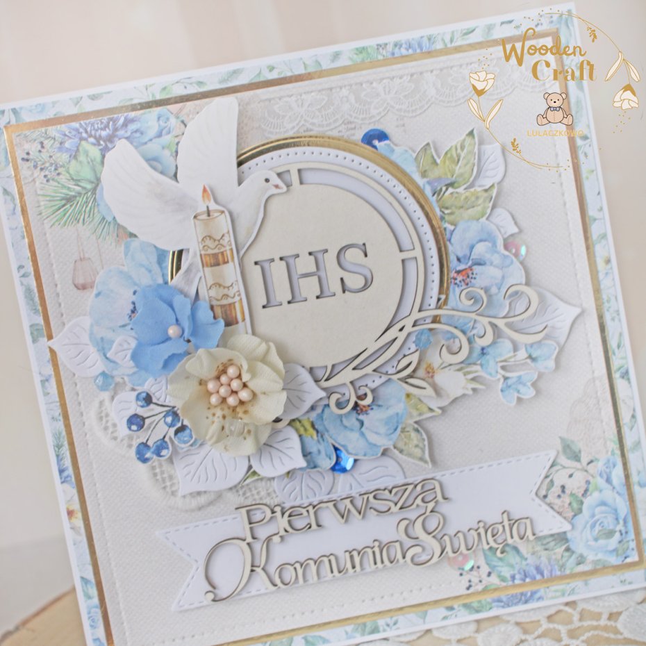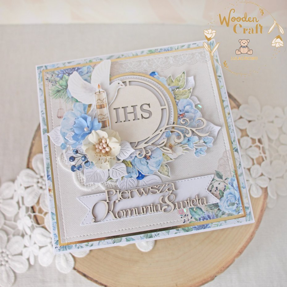 Piękna, elegancka kartka komunijna, pamiątka Pierwszej Komunii Świętej, wykonana ręcznie z najwyższą starannością, z cudownej kolekcji papierów "Sapphire Days", utrzymana w pastelowych odcieniach błękitu, kremu i bieli, z dodatkiem złotych, błyszczących akcentów. Na środku kartki umieszona została tekturka przedstawiająca hostię świętą otoczoną kompozycją kwiatową, z ręcznie wykonanymi, materiałowymi kwiatami, ozdobiona grafikami świecy komunijnej i gołębicy oraz tekturkowym napisem "Pierwsza Komunia Święta"- do napisu mogę również dodać imię dziecka.