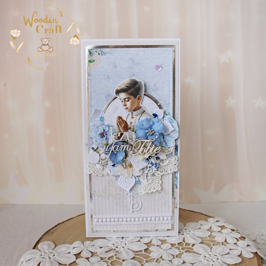 Piękna i elegancka pamiątka Pierwszej Komunii Świętej zamknięta w białym pudełeczku z okienkiem, wykonana ręcznie z najwyższą starannością, z cudownej i delikatnej kolekcji papierów "Sapphire Days", utrzymana w odcieniach delikatnego błękitu, beżu oraz bieli z dodatkiem srebrnych, błyszczących akcentów. Na środku kartki umieszona została grafika modlącego się chłopca komunijnego, ozdobiona kompozycją kwiatową z ręcznie robionymi kwiatami, udekorowana koronką, kryształkami oraz tekturkowym napisem "Jezu ufam Tobie".