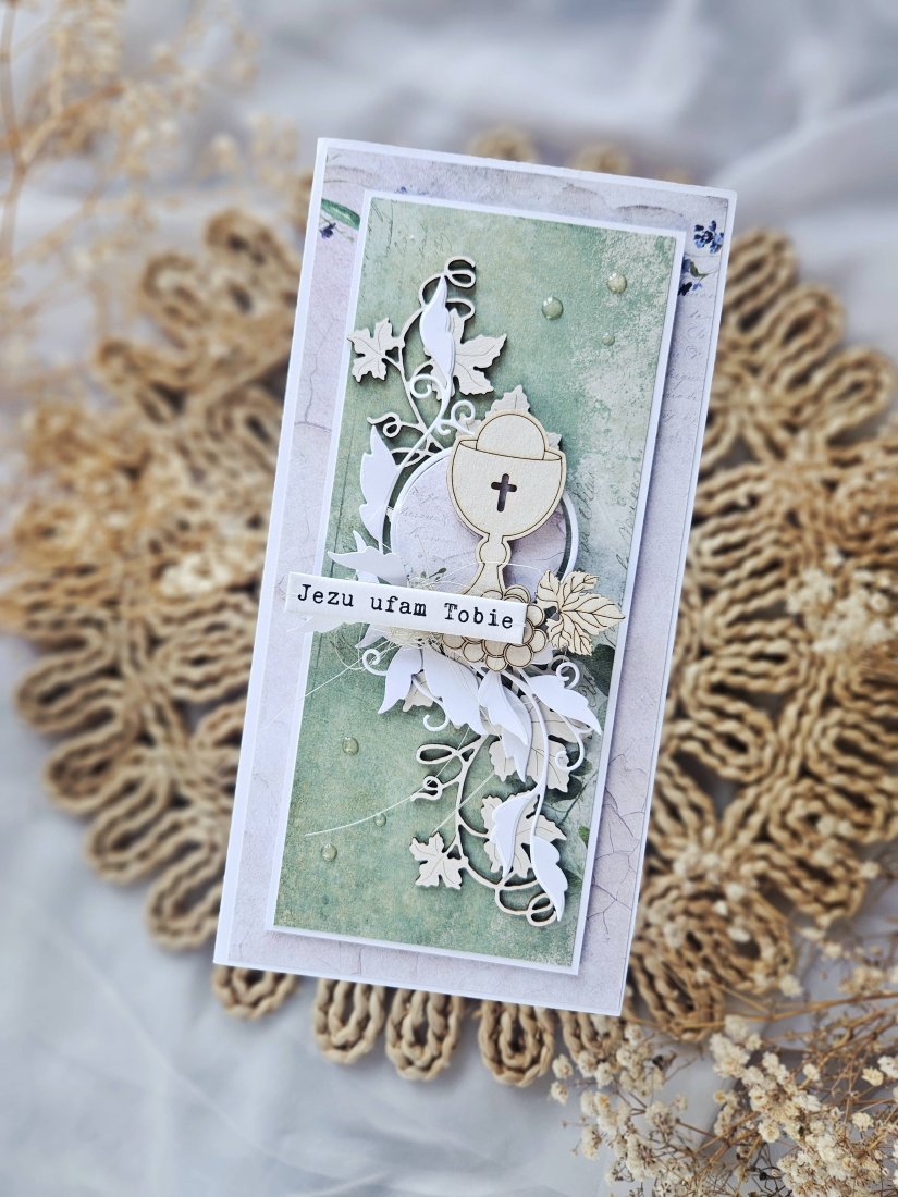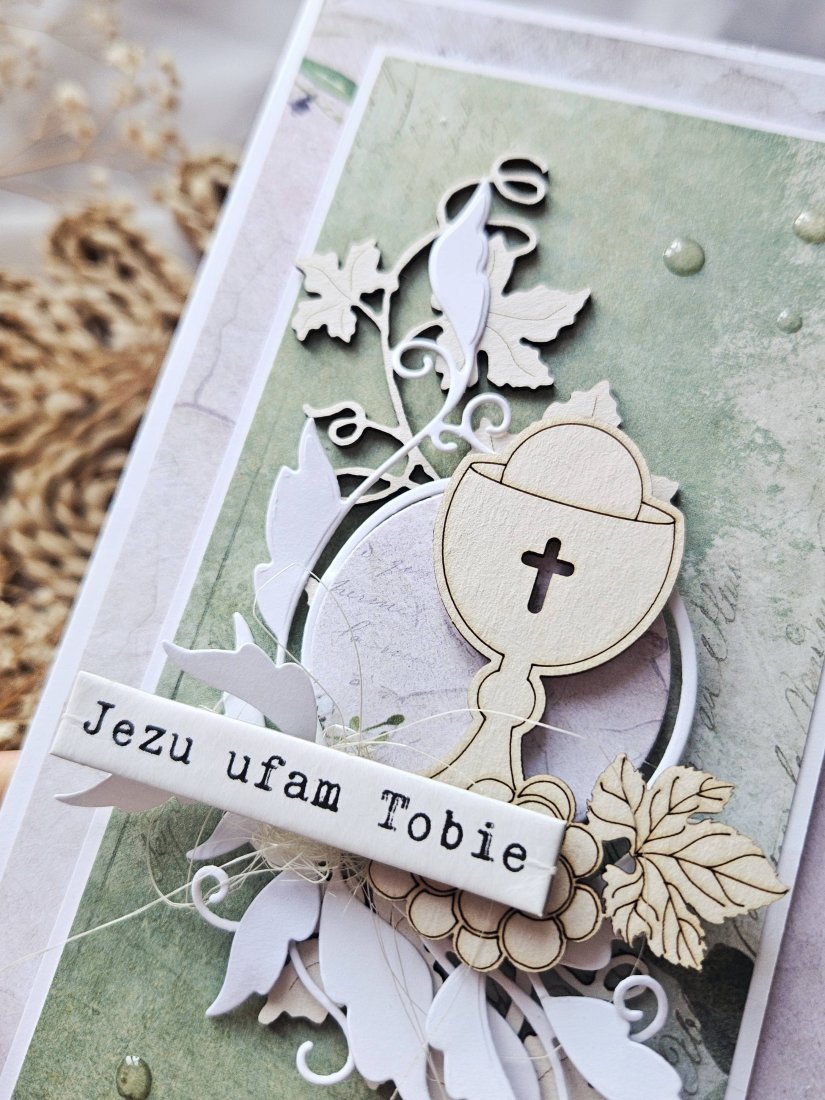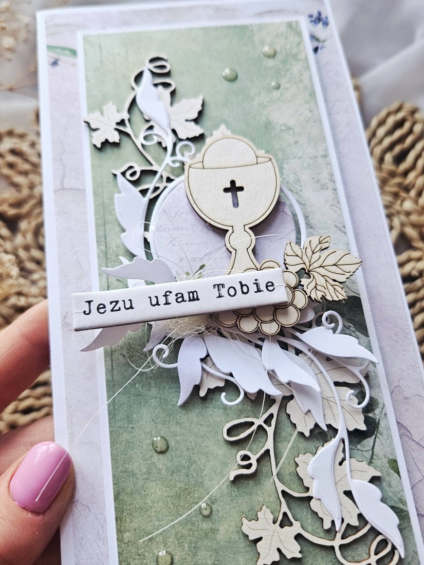 Kartka oklejona papierami z nadrukiem w kolorze zielonym i fioletowym. Na froncie kielich z hostią na drewienku oraz napis.