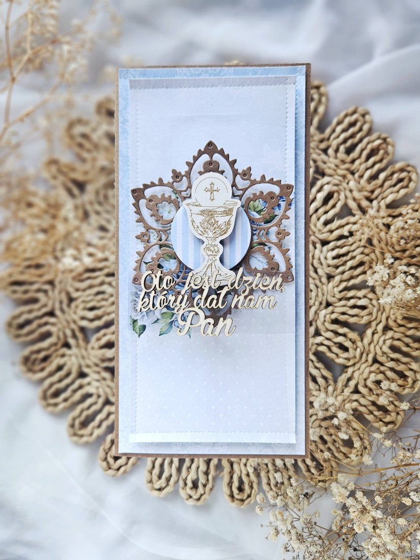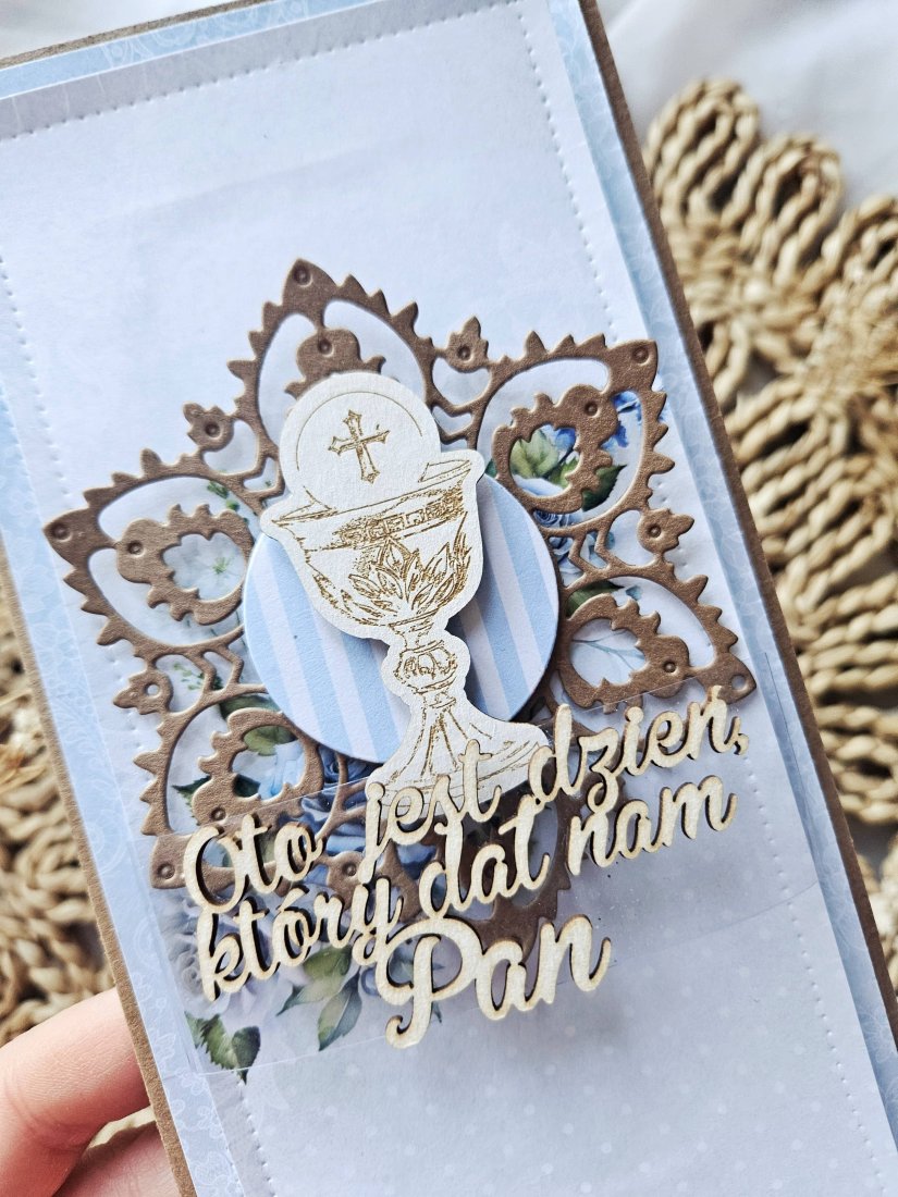 Kartka oklejona papierami z nadrukiem w kolorze zielonym i fioletowym. Na froncie kielich z hostią na drewienku oraz napis.