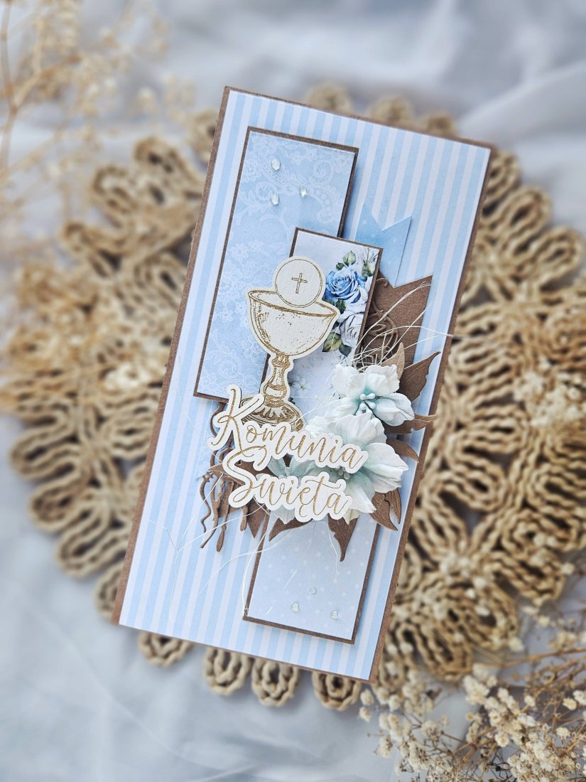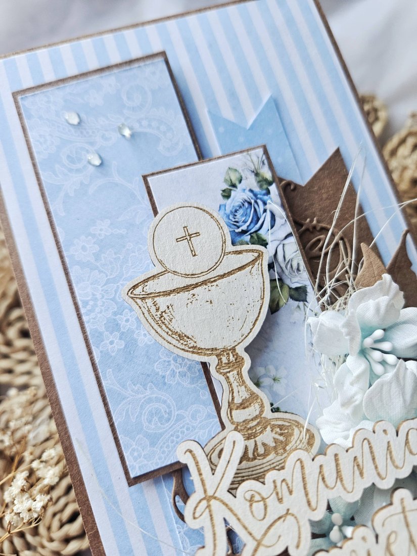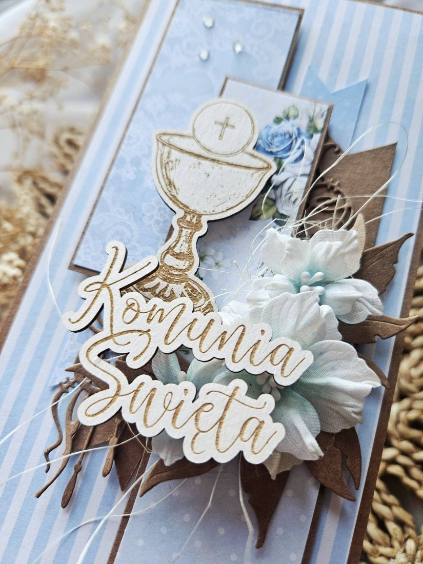 Kartka oklejona papierami z nadrukiem w kolorze niebieskim. Na froncie kielich z hostią na drewienku oraz napis. Jako dodatki kwiaty z materiału, elementy papierowe oraz sizal.