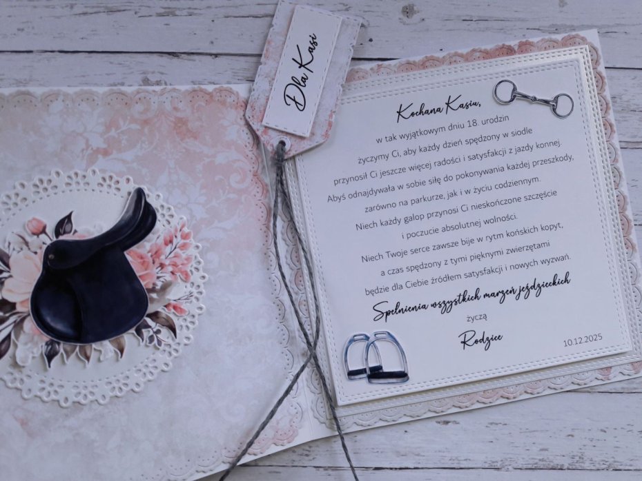 Wręczając życzenia z okazji 18. urodzin wypisane na tej unikatowej, ręcznie robionej kartce, masz pewność, że nie zginą one w tłumie pozostałych i sprawią radość osobie, która pasjonuje się jeździectwem i końmi.