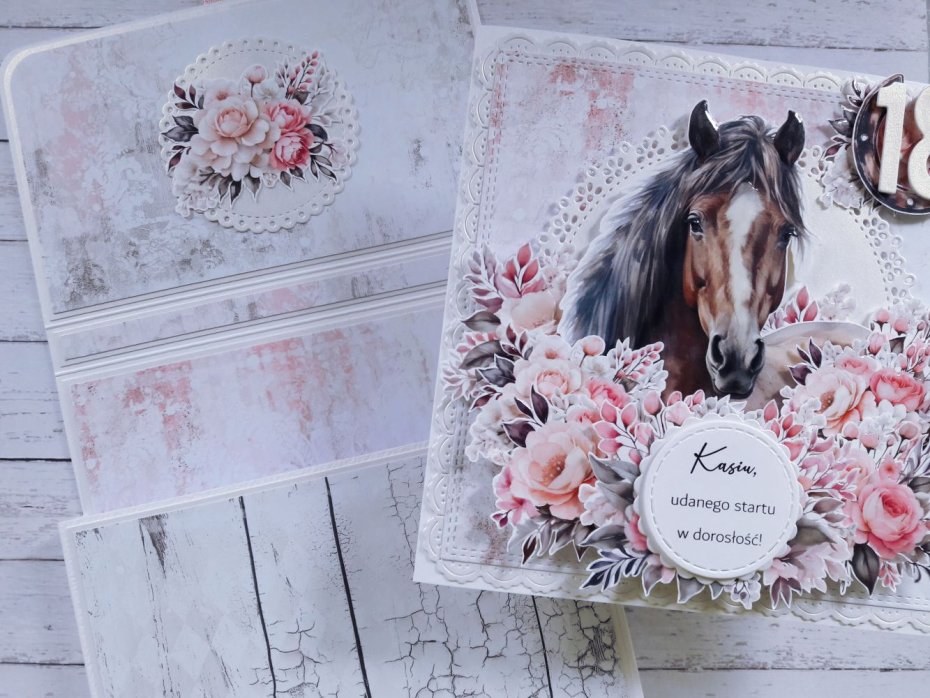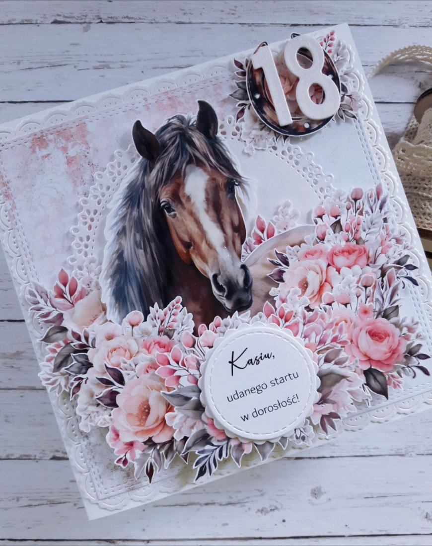 Warstwowa kartka na 18-tkę dla pasjonatki koni z efektem 3D, wykonana metodą scrapbookingu.