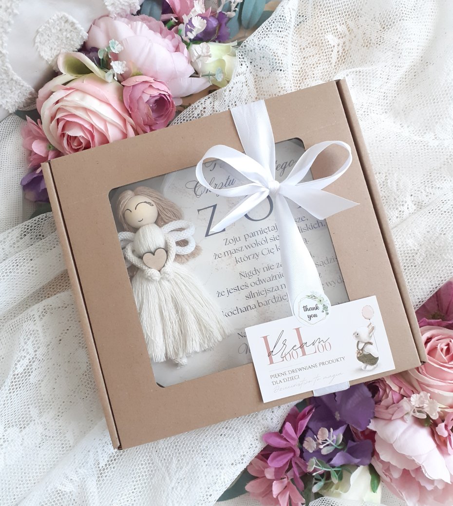 Wyjątkowa, personalizowana kartka z aniołkiem z makramy. Piękny i oryginalny prezent na chrzest święty dziewczynki.