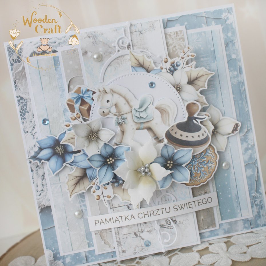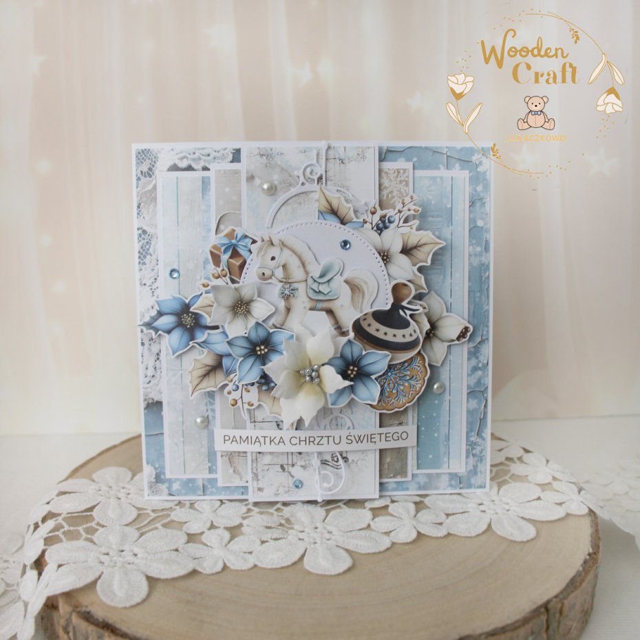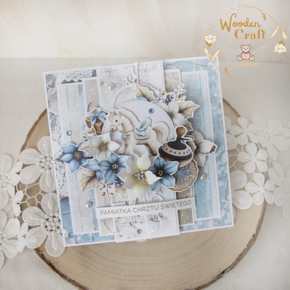 Urocza i nietuzinkowa, warstwowa kartka na chrzest święty dla chłopca, utrzymana w odcieniach błękitu, bieli i beżu. Kartka wykonana ręcznie z dbałością o każdy szczegół, z najnowszej kolekcji papierów "Joly Season". Na froncie znajduje się grafika konika na biegunach, ozdobiona kompozycją kwiatową z ręcznie wykonanym kwiatuszkiem, połyskującymi kryształkami i perełkami, a także napisem "Pamiątka Chrztu Świętego" (na życzenie mogę wkleić na kartce również imię dziecka lub całkowicie zmienić napis na inny).