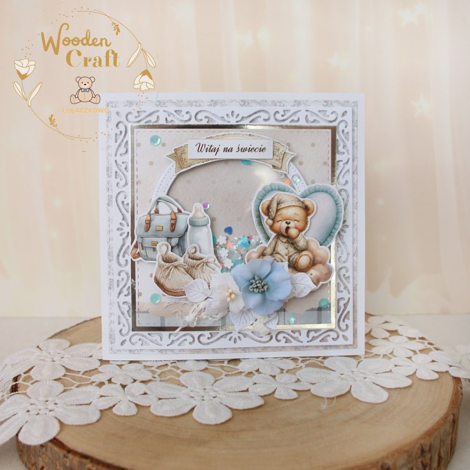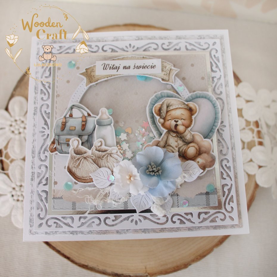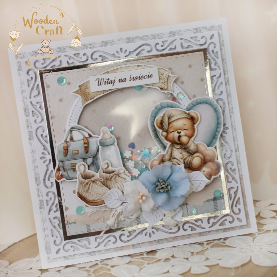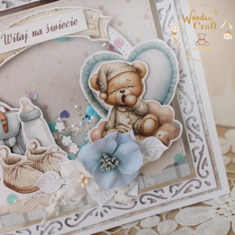 Przepiękna idelikatna kartka gratulacyjna z okazji narodzin maluszka, utrzymana w odcieniach błękitu i bieli z dodatkiem srebrnych błyszczących akcentów. Kartka z shaker boxem - mini pudełeczkiem w którym umieszczone zostały cekiny i drobinki, które po potrząśnięciu przesuwają się. Kartka wykonana ręcznie z dbałością o każdy szczegół, z cudownej, dziecięcej kolekcji papierów "The Baby". Na froncie znajduje się grafika uroczego, ziewającego pluszowego misia, ozdobiona kompozycją kwiatową z materiałowych kwiatuszków, dodatkowo zdobiona cekinami, a także napisem "Witaj na świecie" (na życzenie mogę wkleić na kartce również imię dziecka lub zmienić napis na inny - w zależności od okazji, np. na chrzest, bądź roczek).