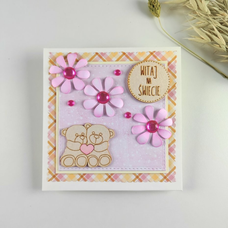 Kartka na narodziny dziecka, misie. Wewnątrz miejsce na samodzielne wpisanie życzeń.