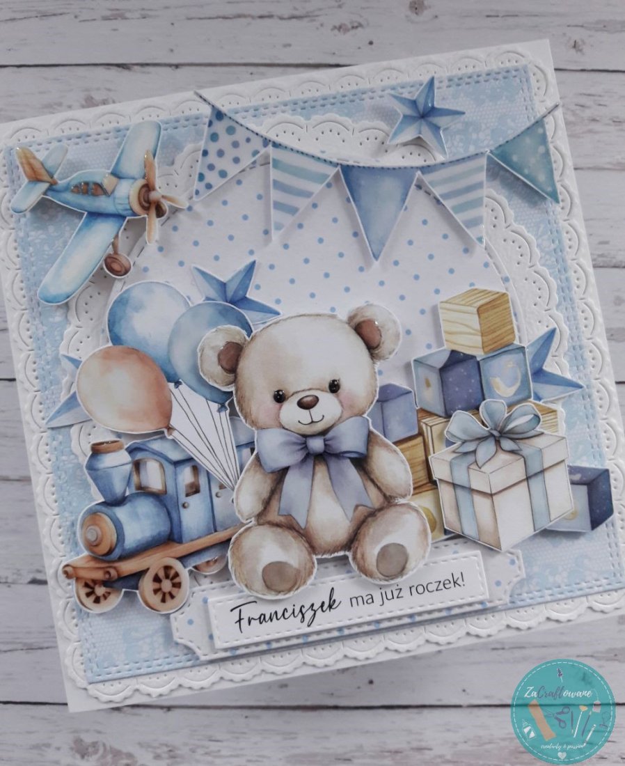 Motywem przewodnim kartki jest pokój dziecięcy wypełniony zabawkami, w tym trzymającym balony uroczym misiem, który tylko czeka na świętowanie 1. urodzin razem z Maluszkiem.