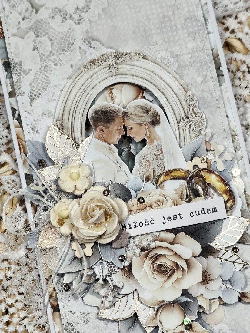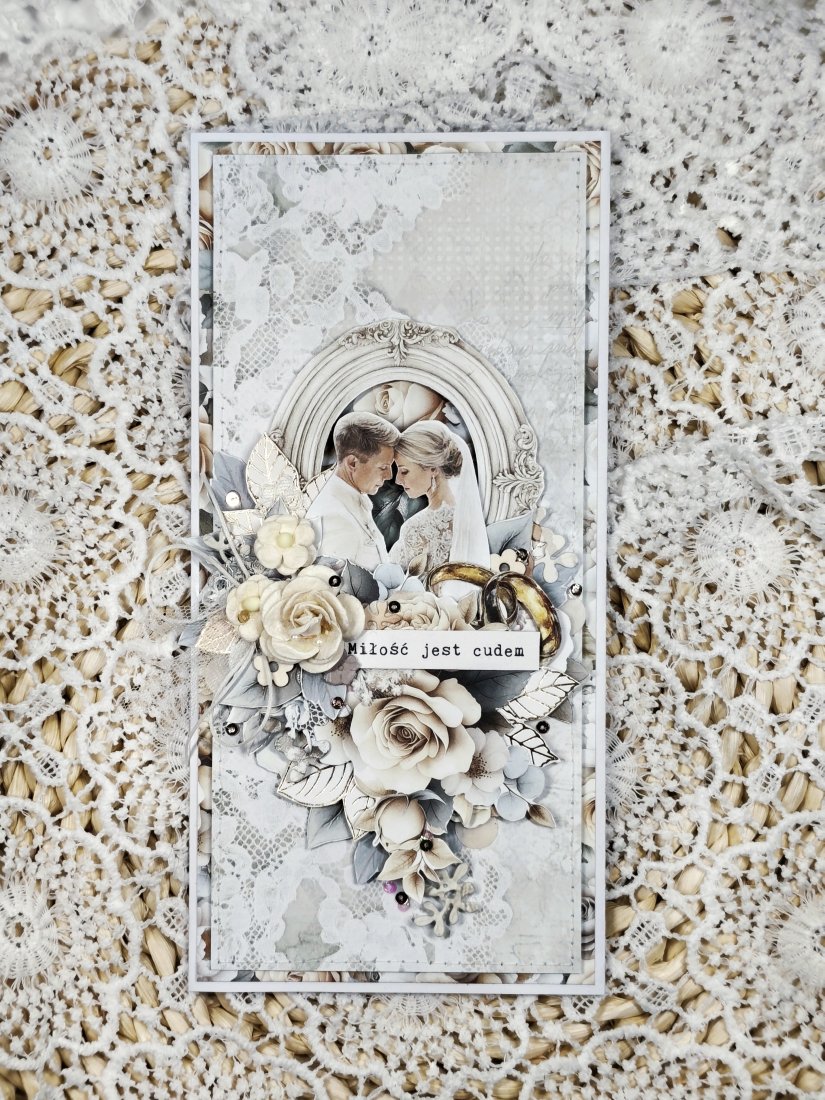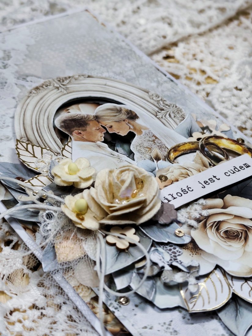 Każda kartka posiada unikalną kompozycję, wykonaną z delikatnej koronki oraz eleganckich kwiatków. Nie ma dwóch identycznych kartek — każda jest jedyna w swoim rodzaju.