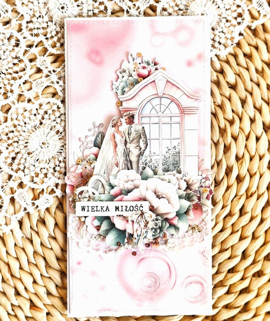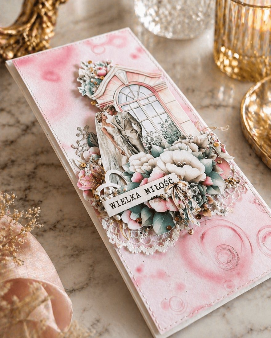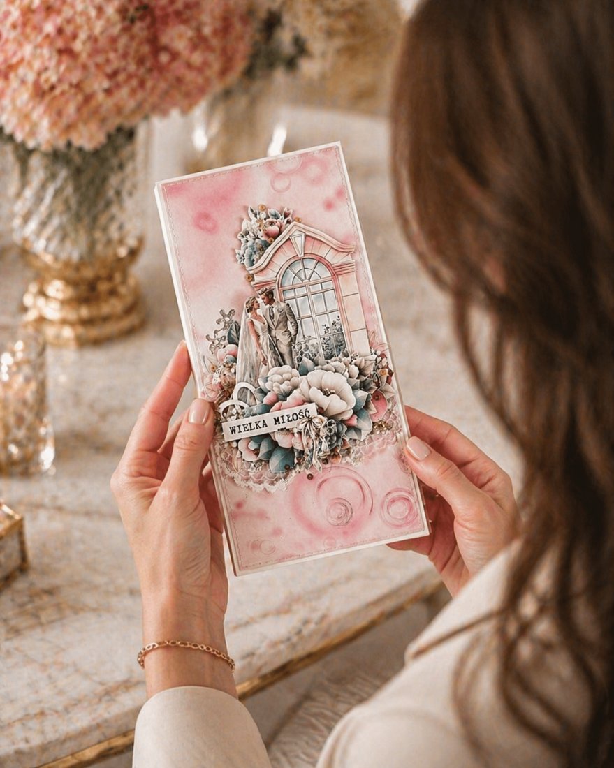 Każda kartka posiada unikalną kompozycję, wykonaną z delikatnej koronki oraz eleganckich kwiatków. Nie ma dwóch identycznych kartek — każda jest jedyna w swoim rodzaju.